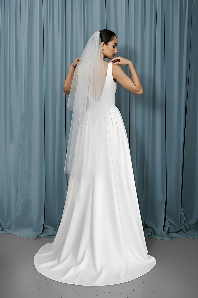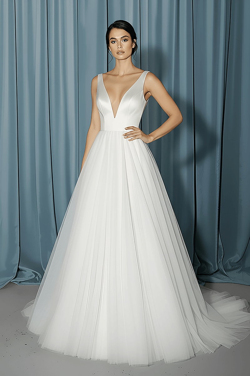 Shinny Charmeuse / Tulle - Ivory Matt Silk / Tulle - Ivory Printed Silk / Tulle - IvoryDeep V + Tull A-line -Regular price From $3,500.00Regular priceUnit price / per