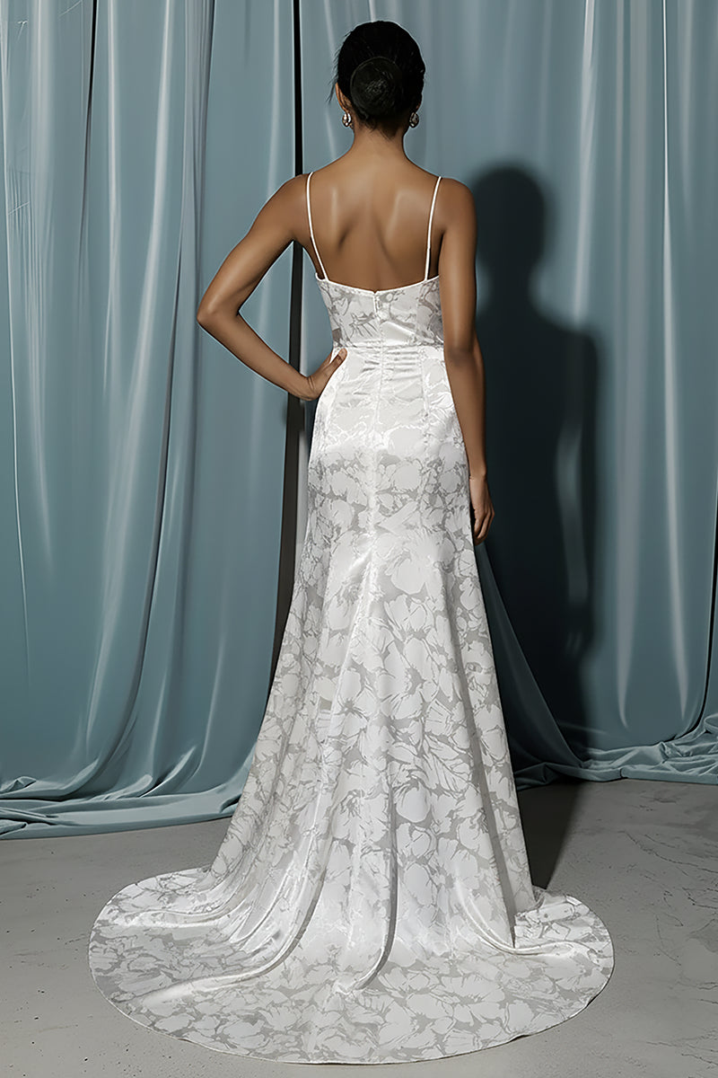 Balconette bustier with spaghetti straps and shirred chiffon cups, paired with a sleek column skirt for a streamlined silhouette.