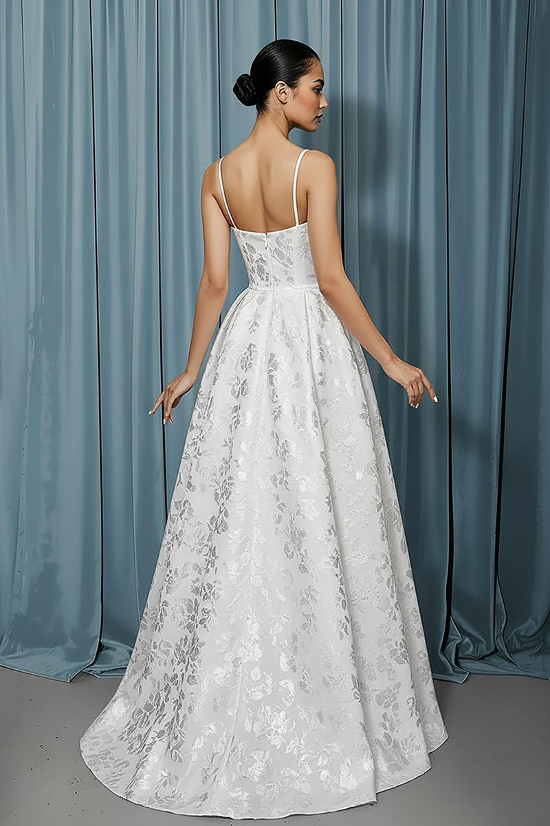 Balconette bustier with spaghetti straps and softly draped cups, paired with a dropped-waist A-line skirt. Shirred panels create volume and flow, giving the gown a modern and refined silhouette.