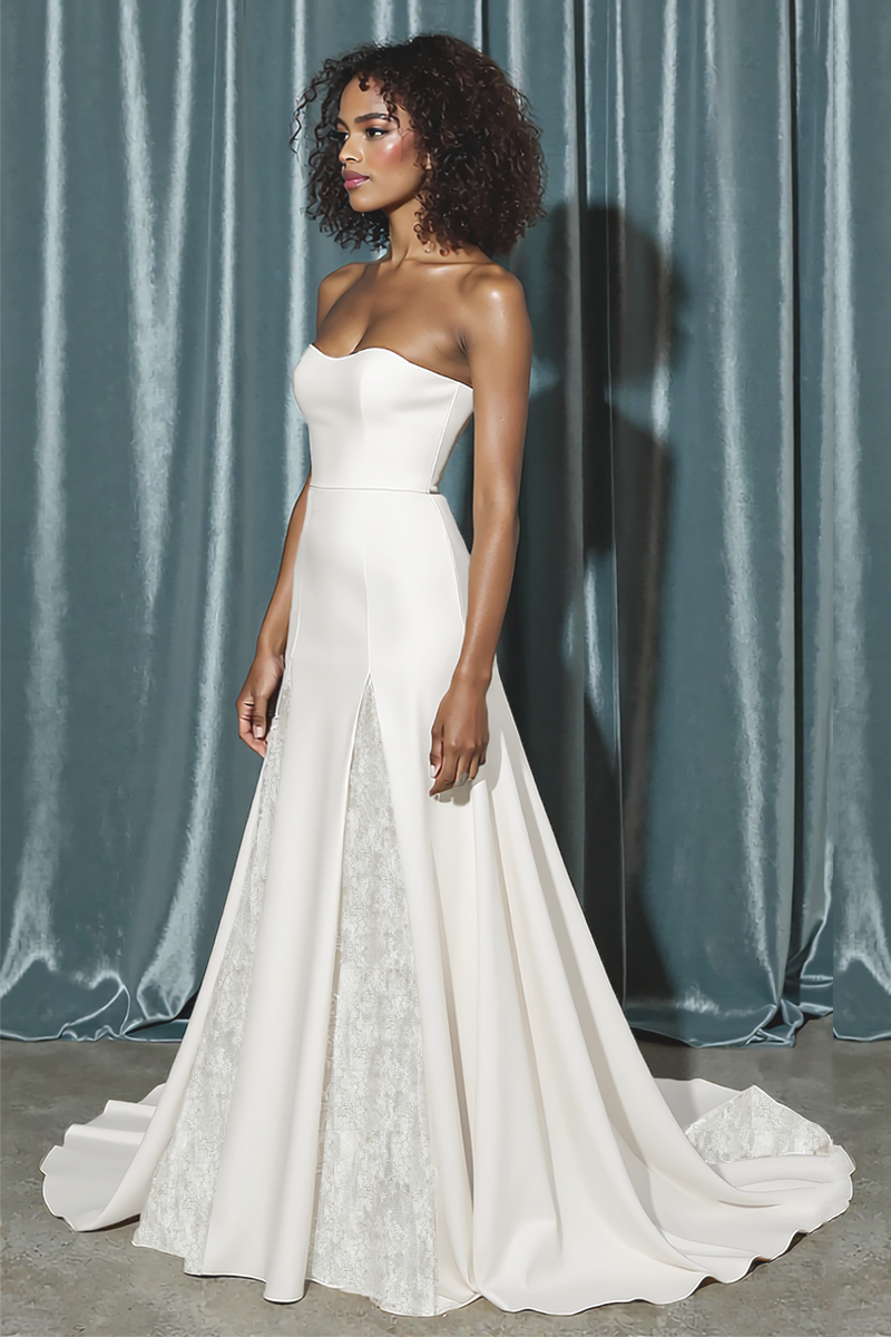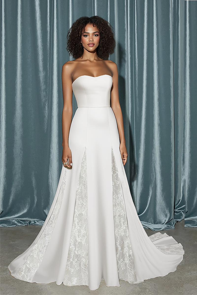 Romantic lace cutouts flow through the A-line skirt, balanced by a clean, structured sweetheart bustier. A perfect blend of femininity and contemporary edge.