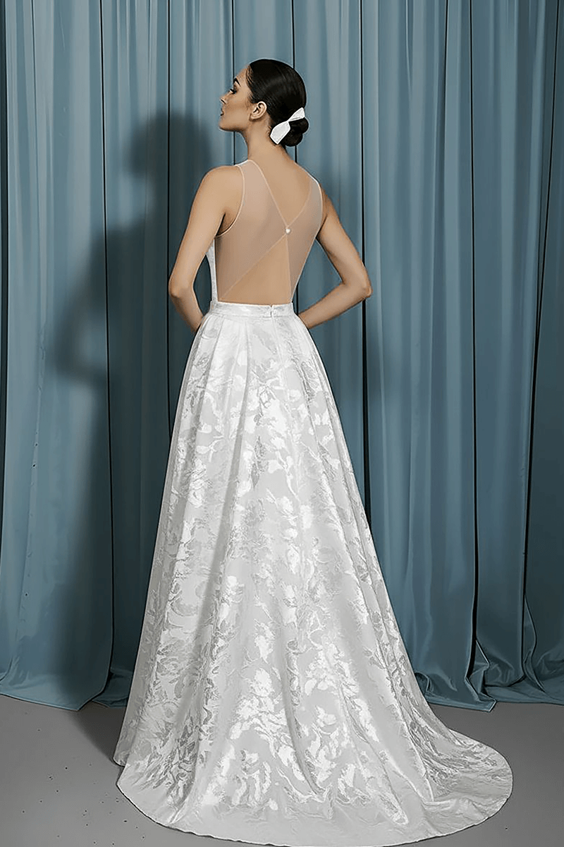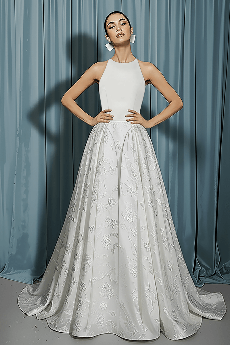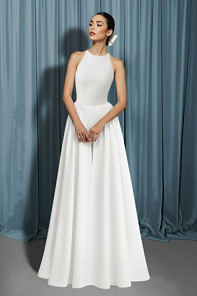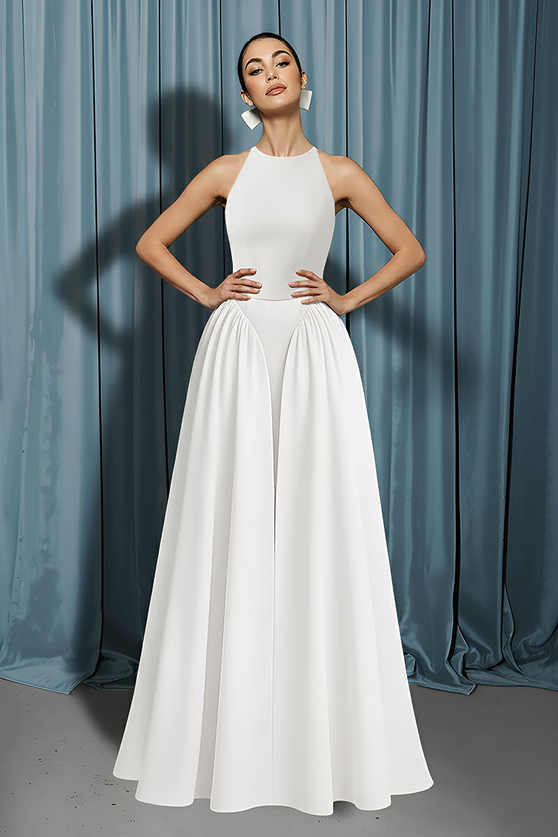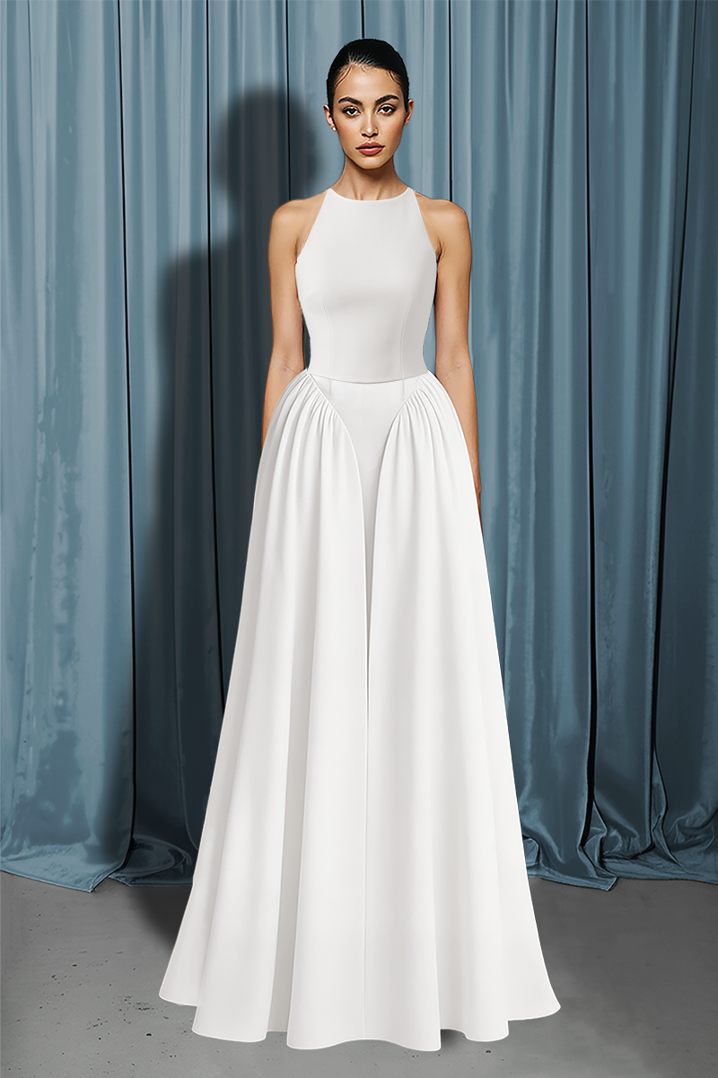 A crew boatneck bodice paired with a flowing A-line drop-waist skirt. The shirred sides provide a flattering fit for all body types, making this a simple and timeless choice.