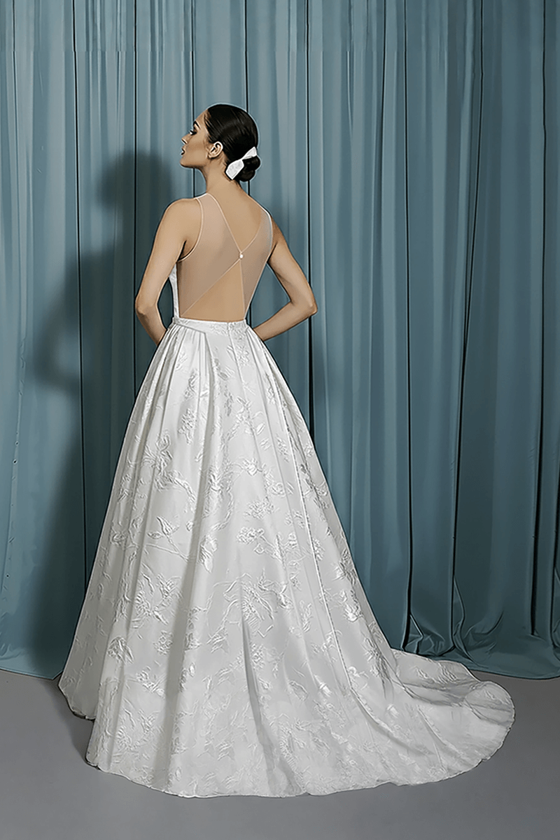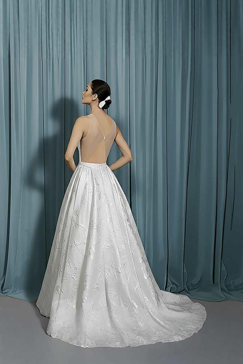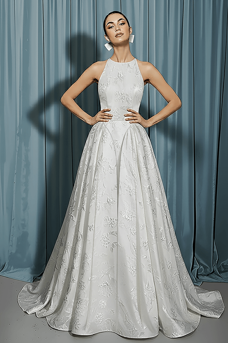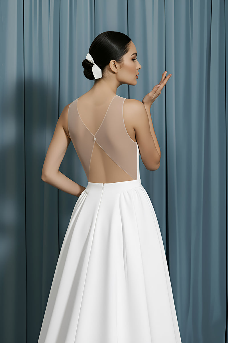 A crew boatneck bodice paired with a flowing A-line drop-waist skirt. The shirred sides provide a flattering fit for all body types, making this a simple and timeless choice.