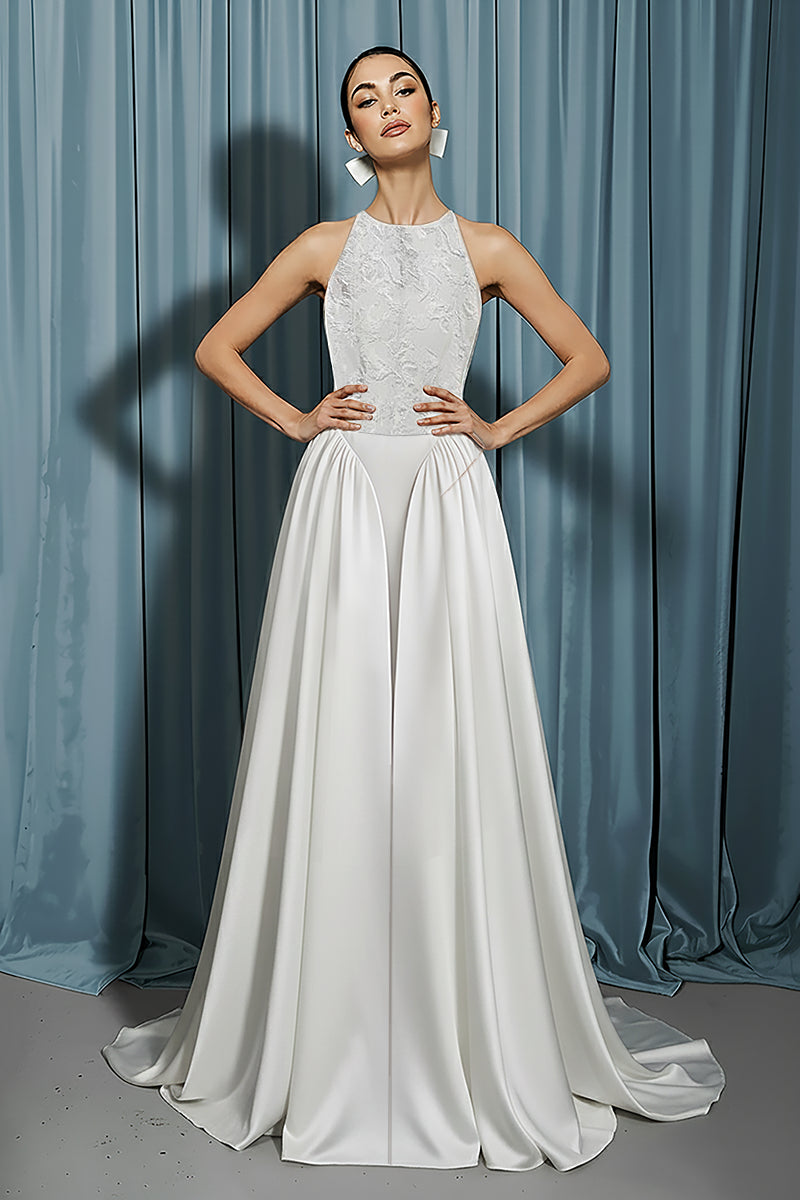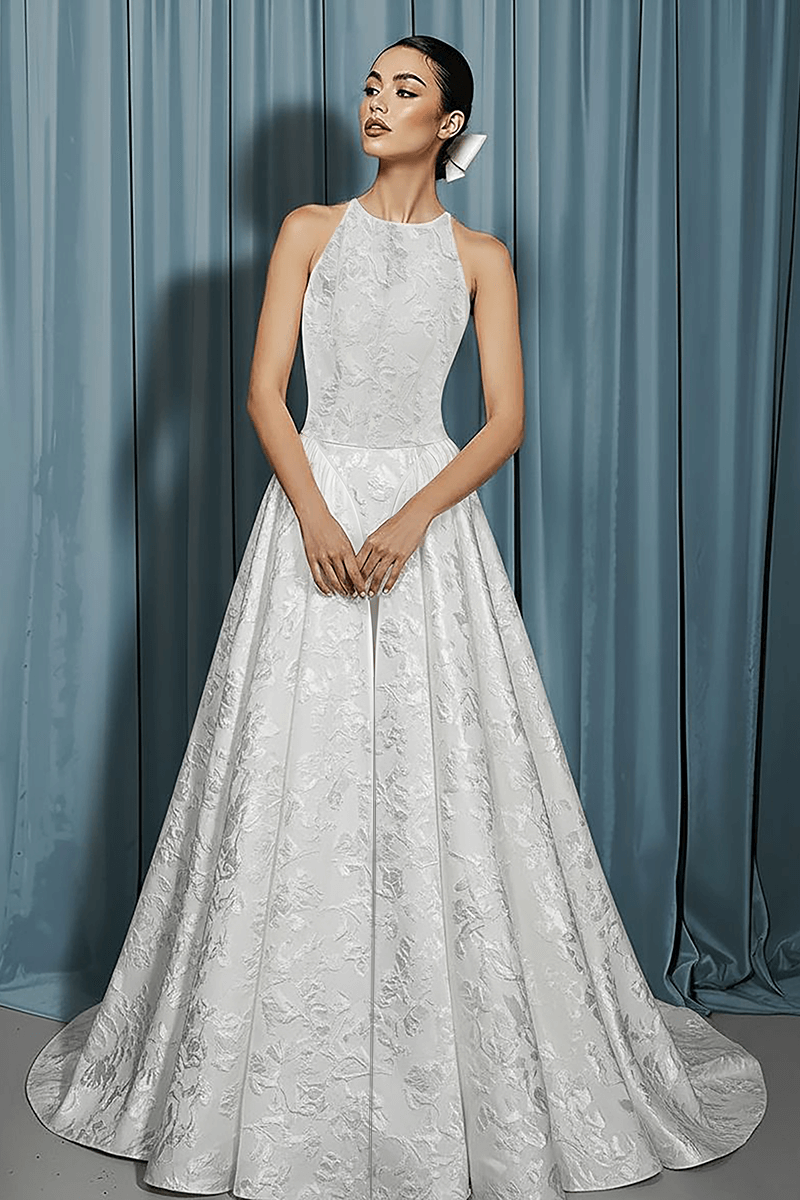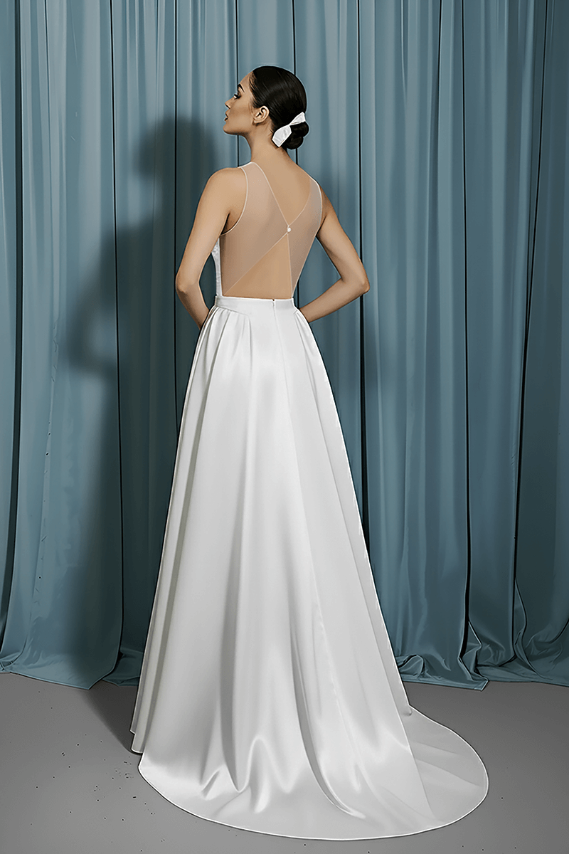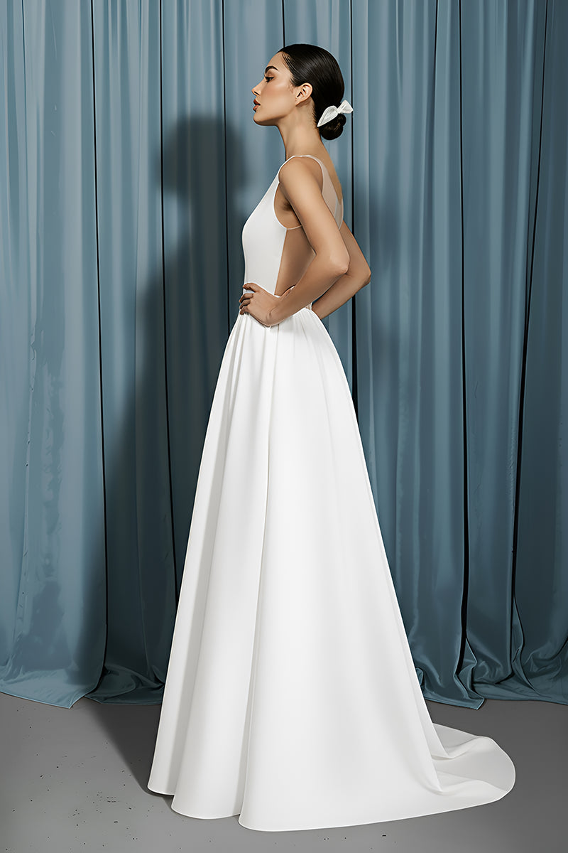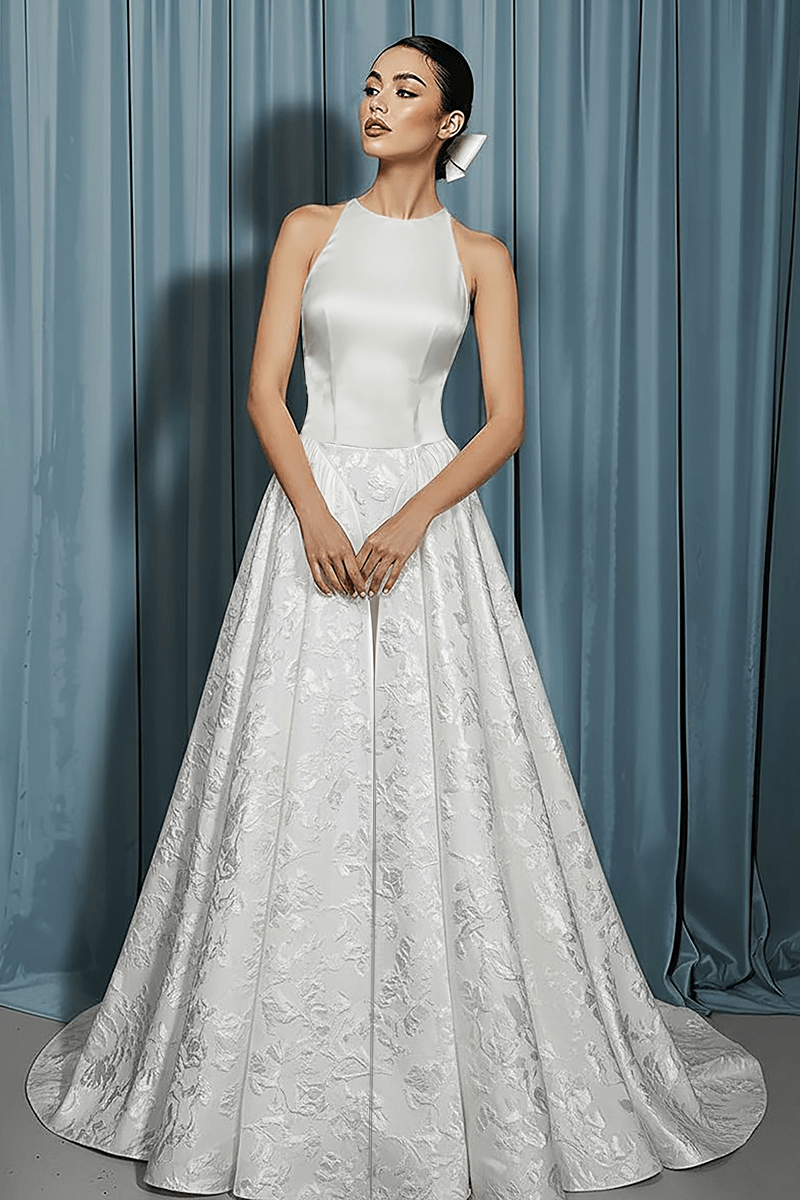 A crew boatneck bodice paired with a flowing A-line drop-waist skirt. The shirred sides provide a flattering fit for all body types, making this a simple and timeless choice.