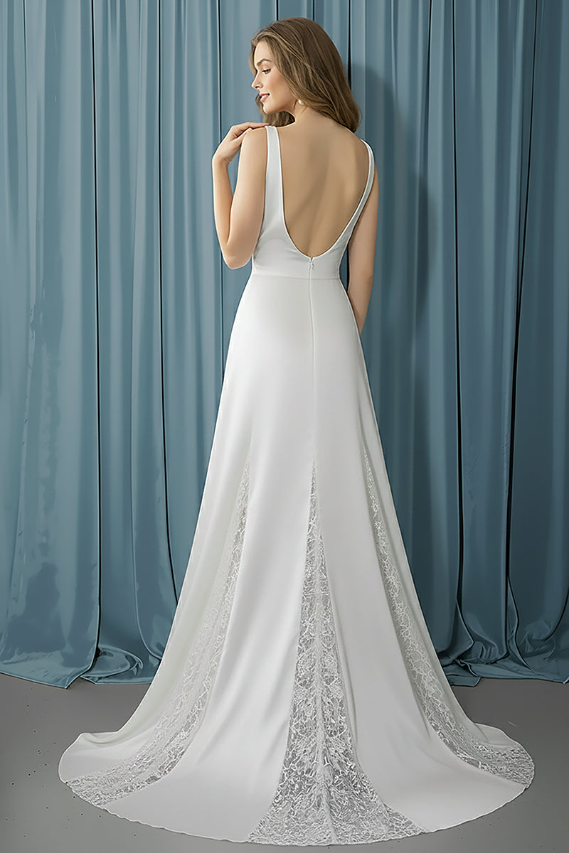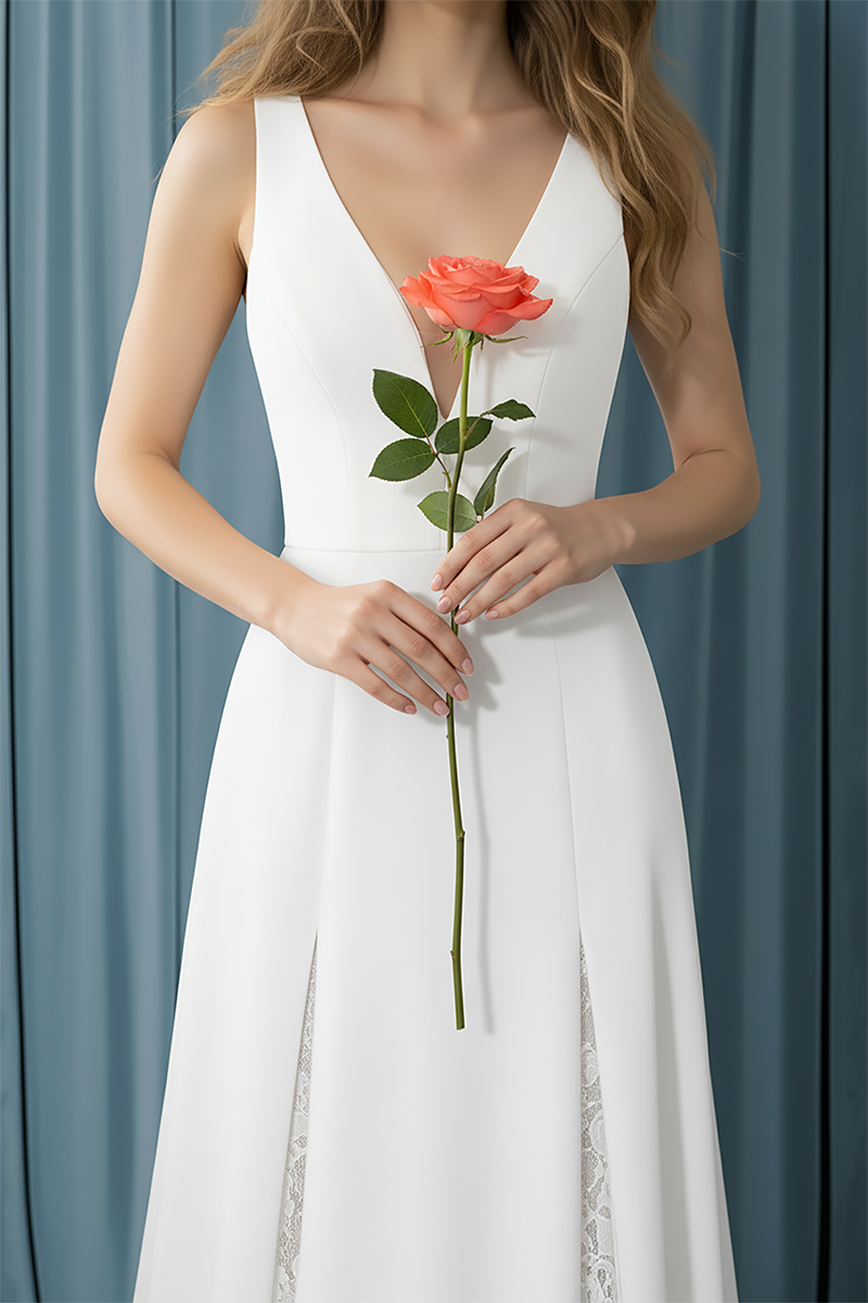 A-line skirt with lace cutouts throughout, paired with a deep V neckline front and back.The classic silhouette is updated with modern detailing for a clean, contemporary bridal look.