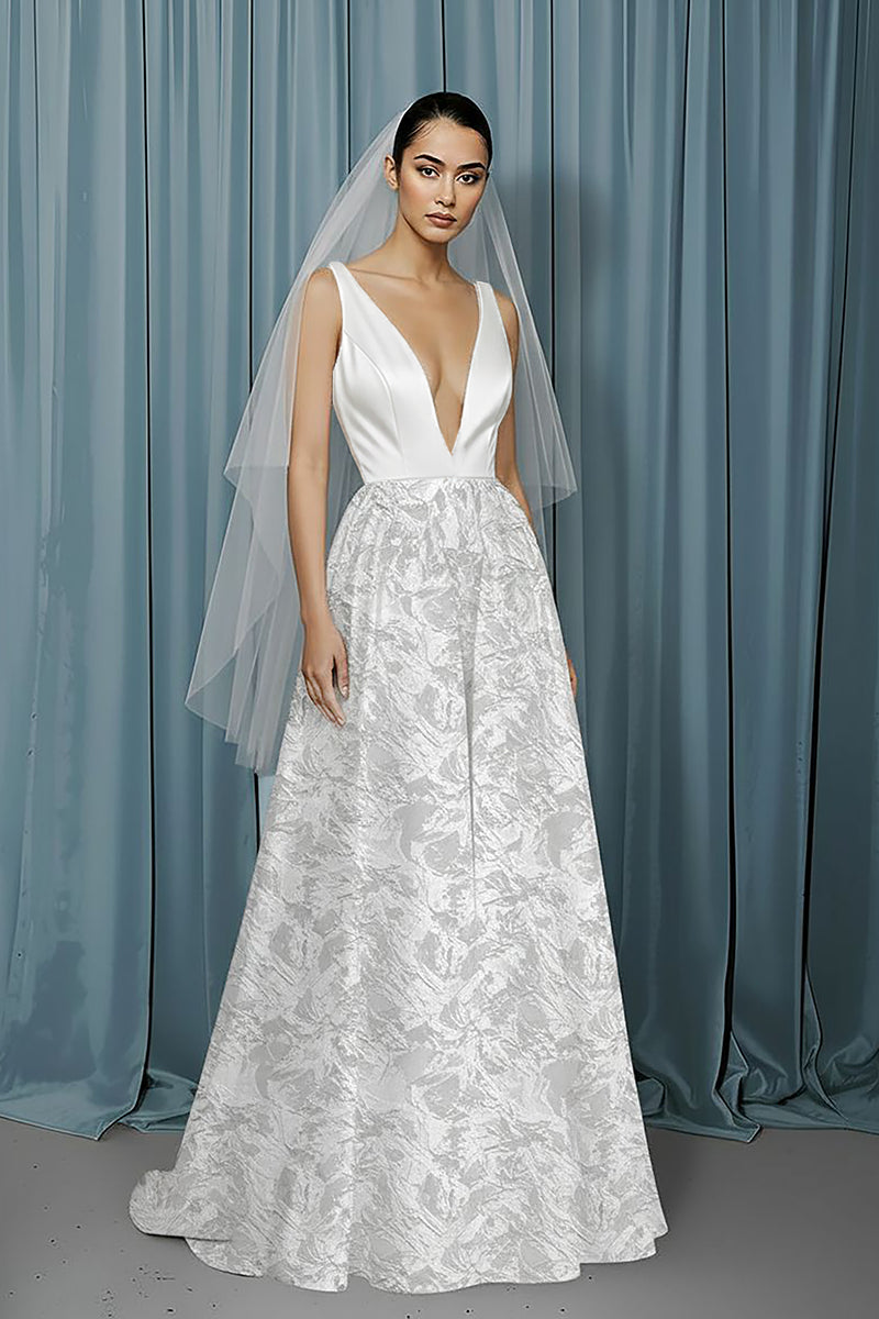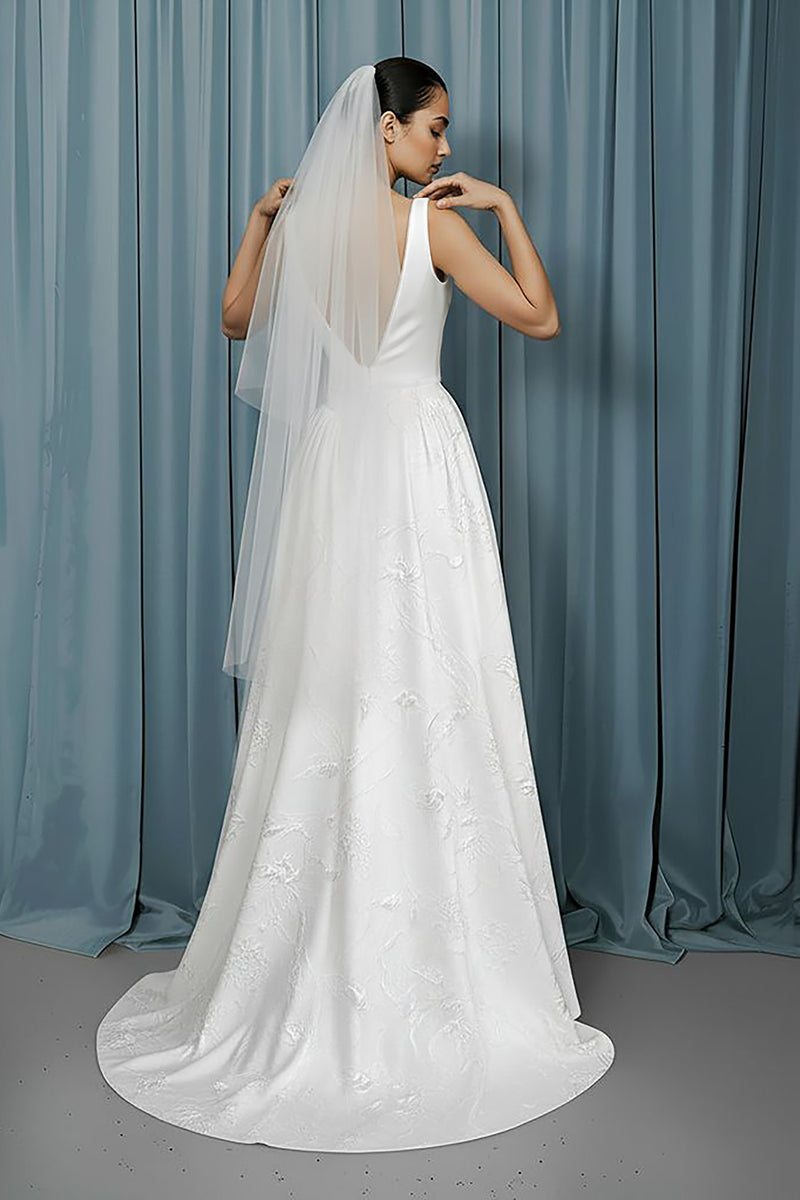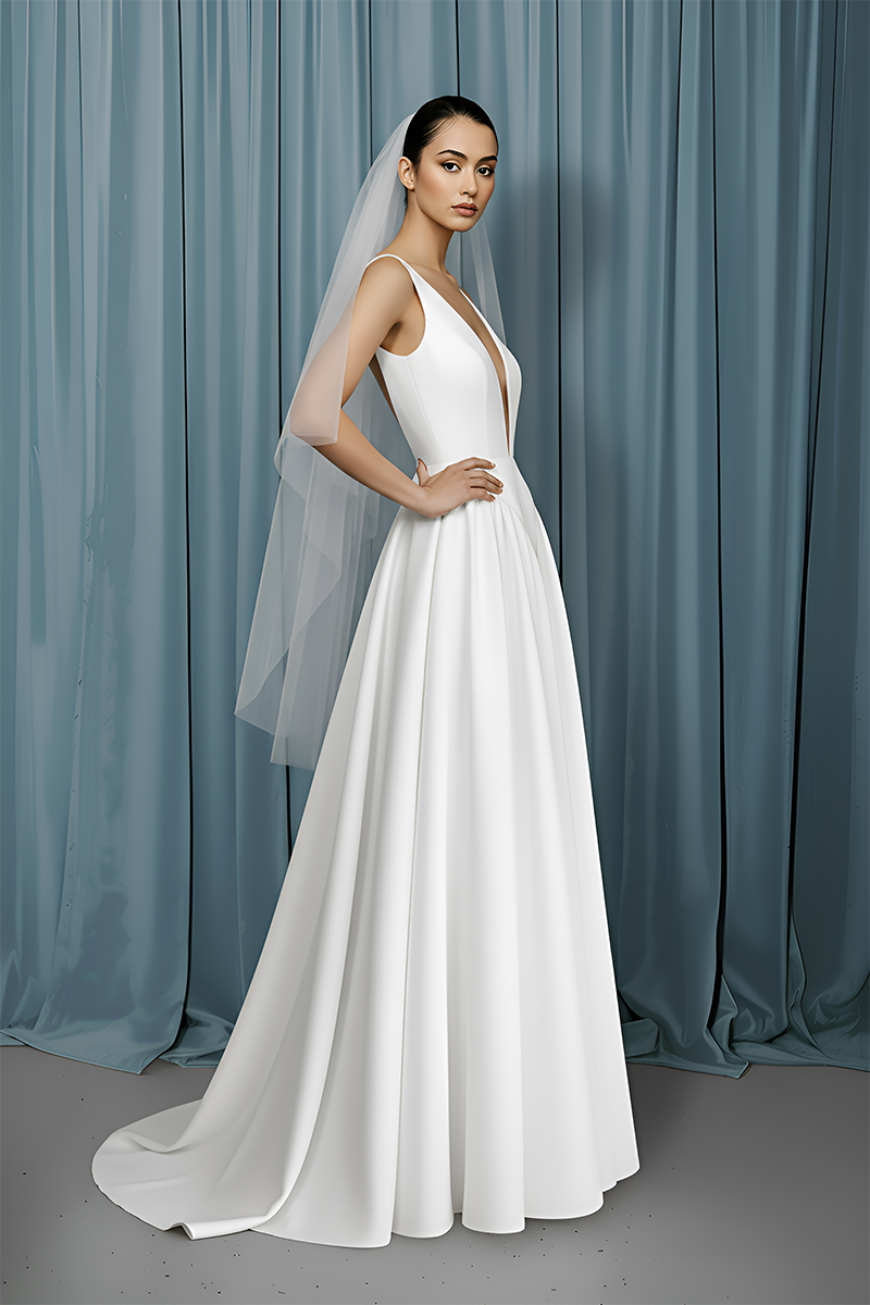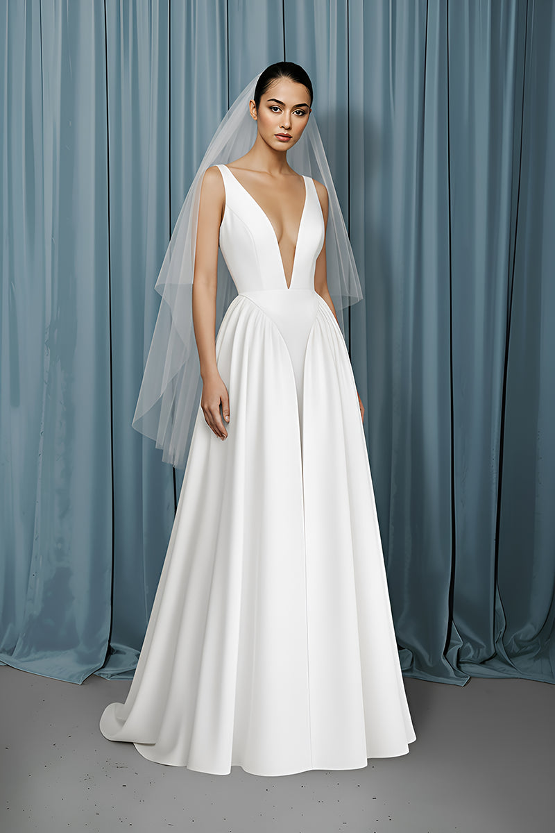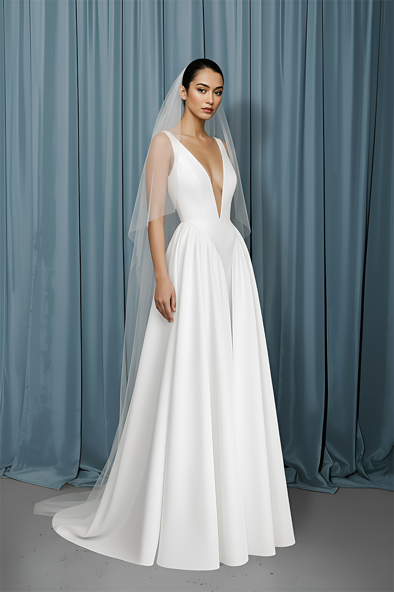 Deep V neckline front and back with a flowing A-line drop-waist skirt. Shirred sides create a flattering fit across body types for a clean, timeless look.