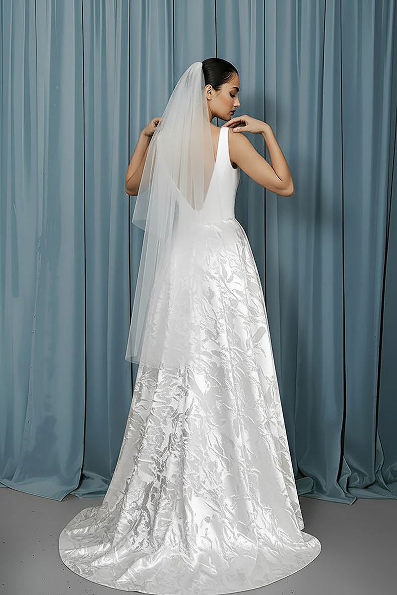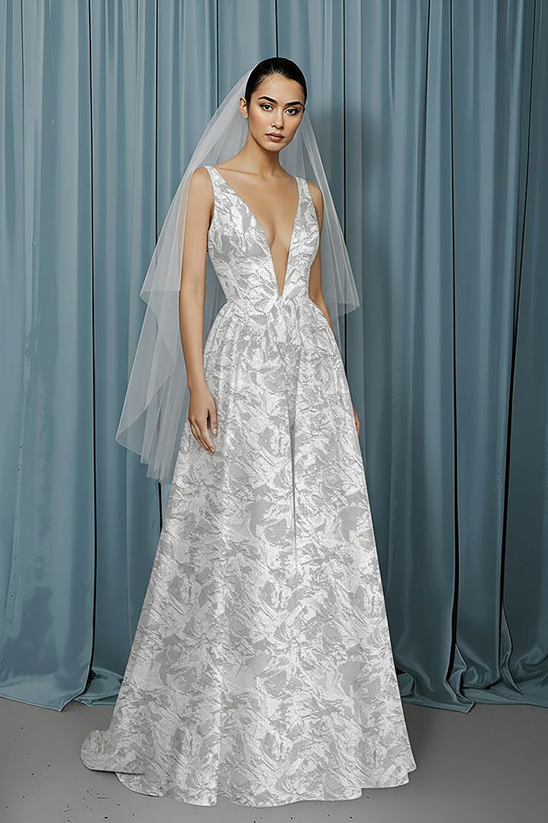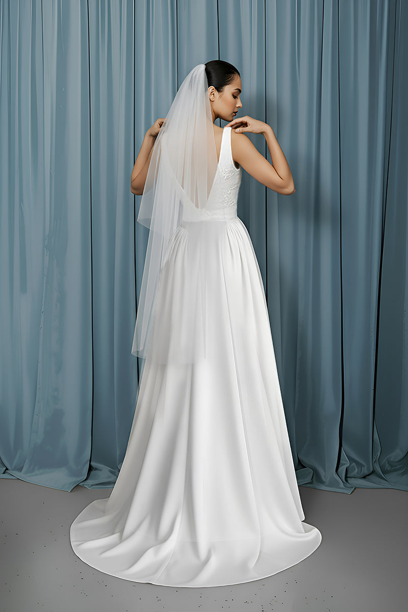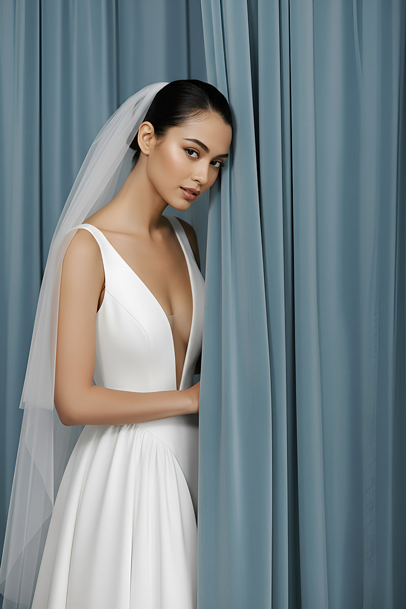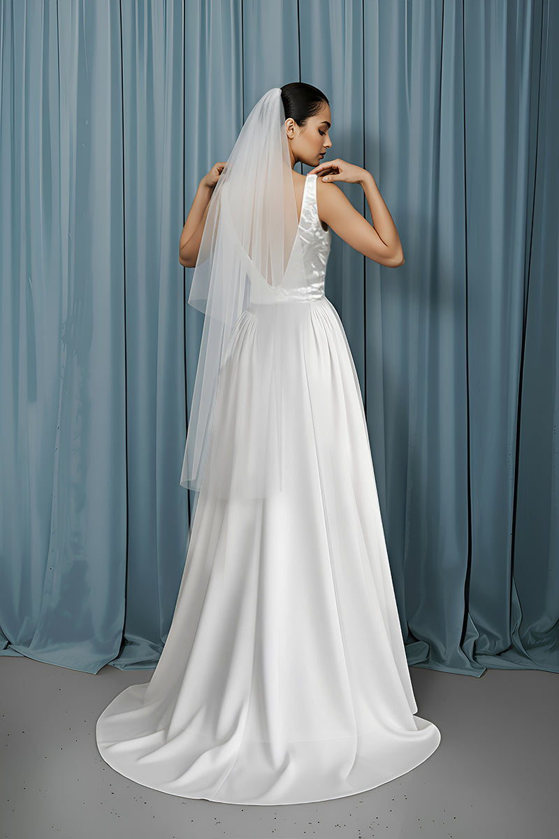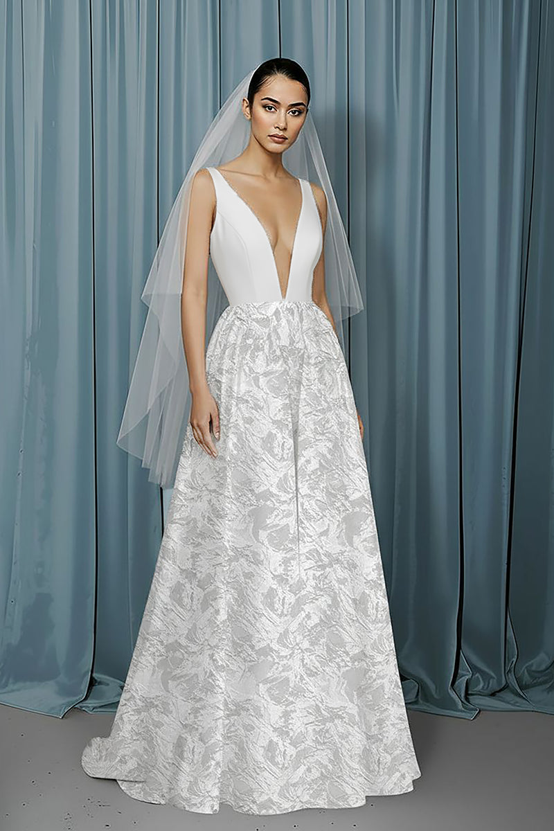 Deep V neckline front and back with a flowing A-line drop-waist skirt. Shirred sides create a flattering fit across body types for a clean, timeless look.