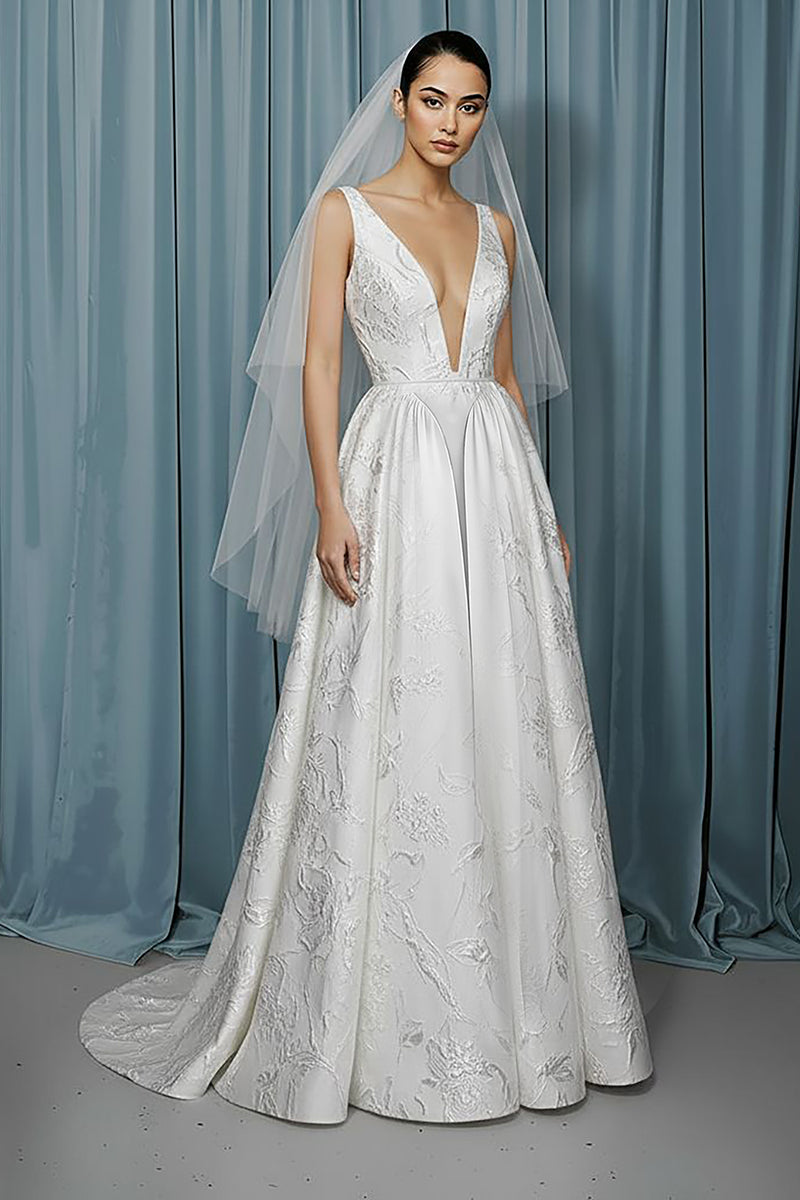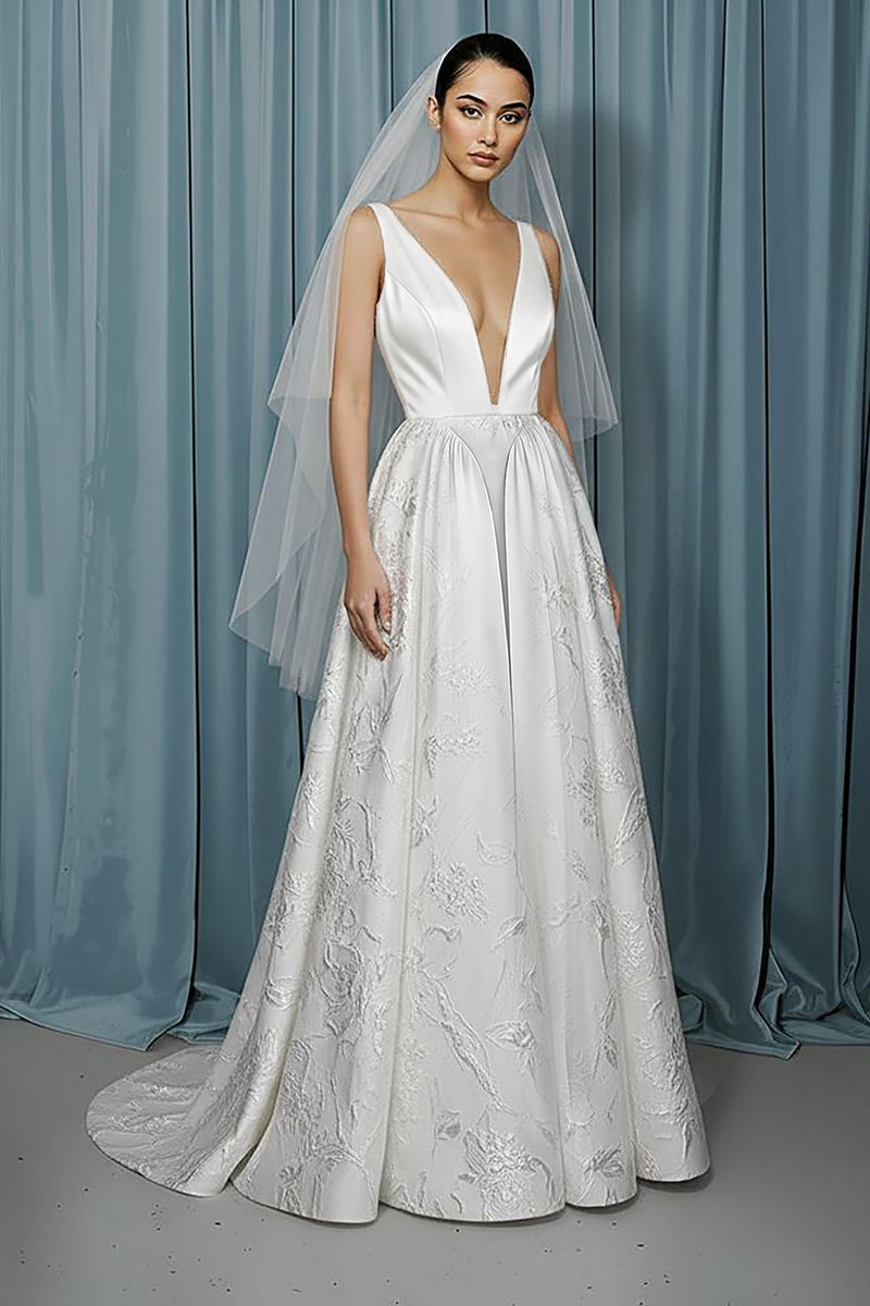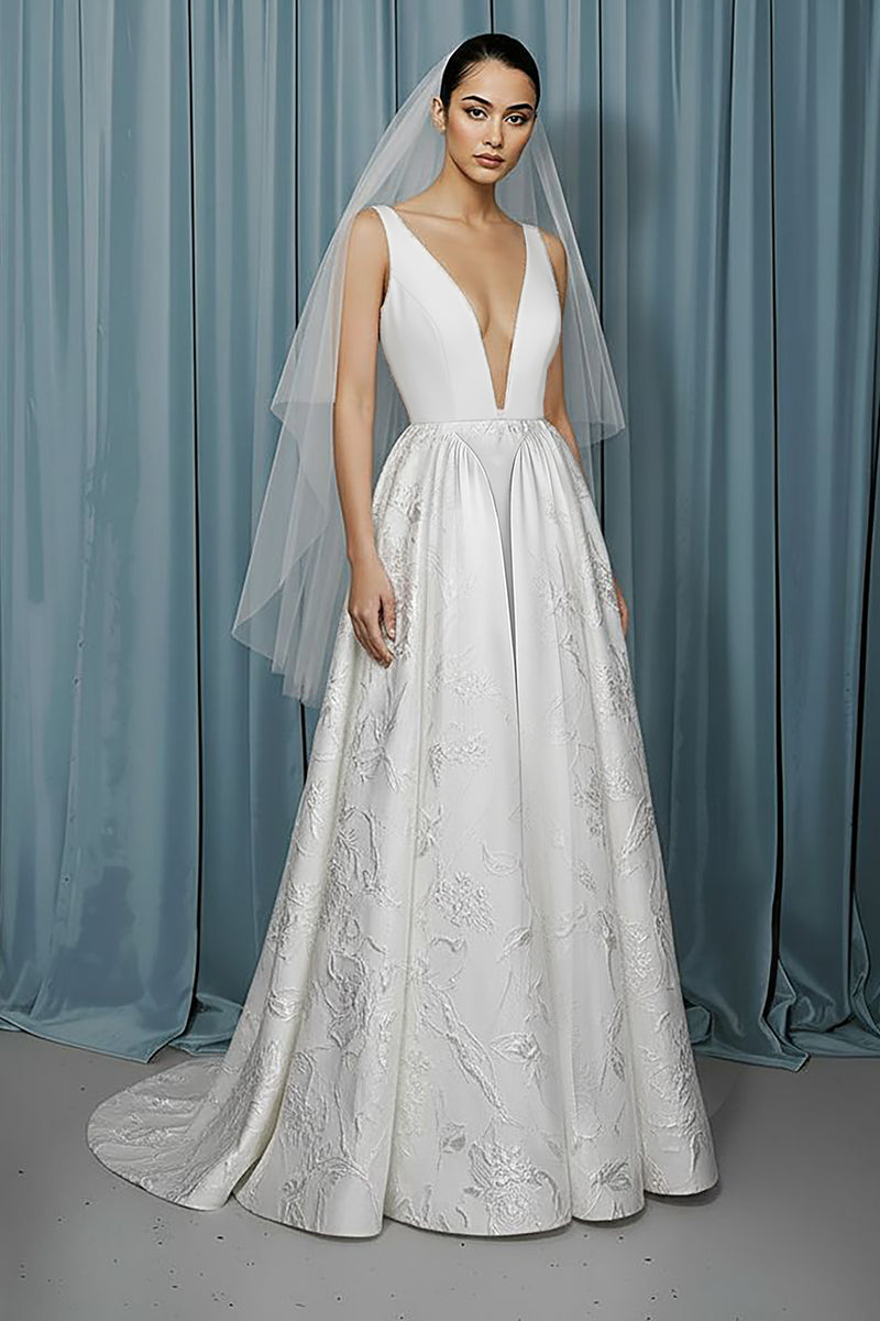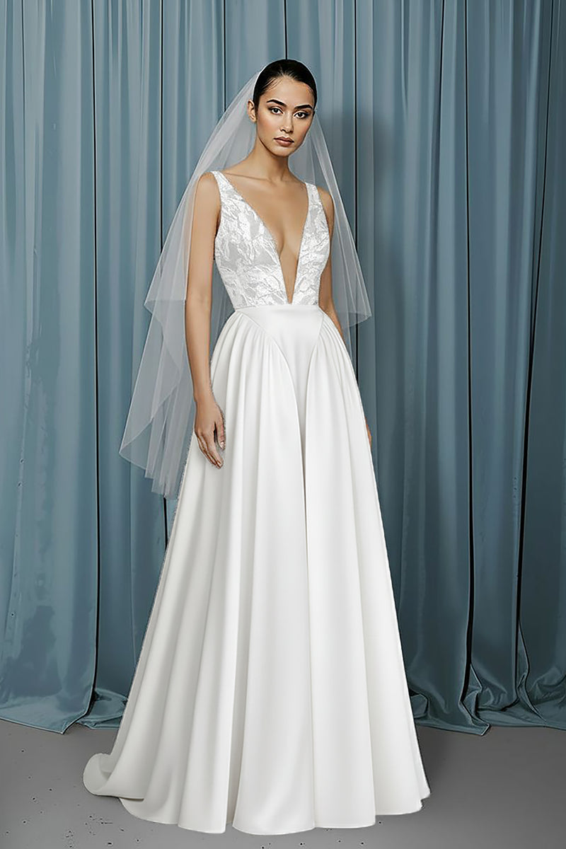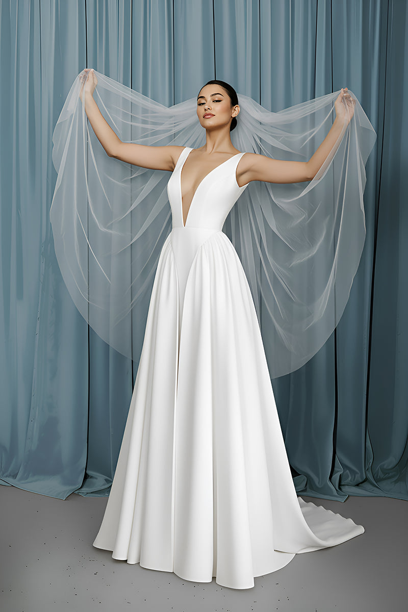 Deep V neckline front and back with a flowing A-line drop-waist skirt. Shirred sides create a flattering fit across body types for a clean, timeless look.