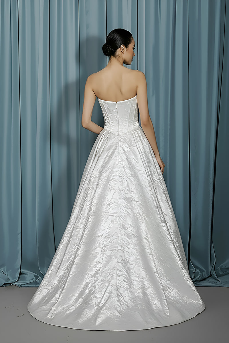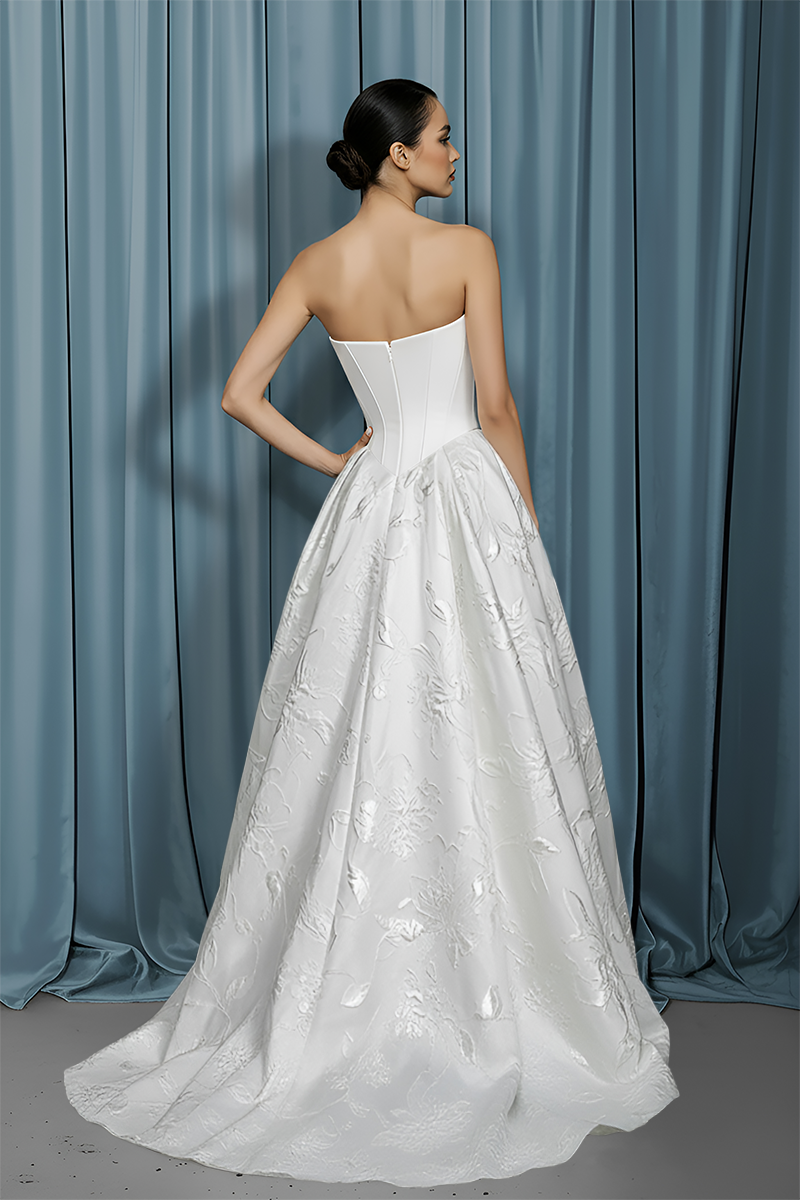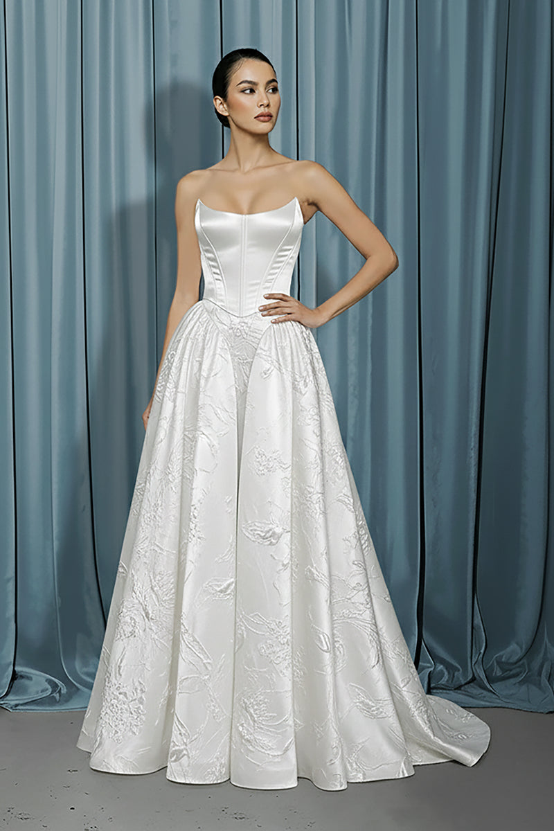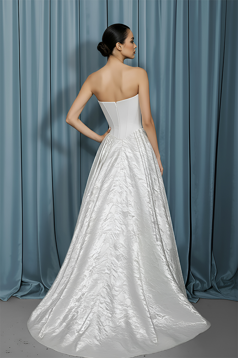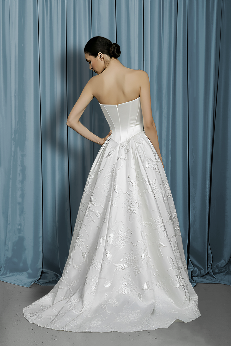 Scooped neckline bustier with encased boning, paired with a dropped-waist skirt and shirred sides for a flattering fit. A silhouette with Baroque drama and Victorian structure.