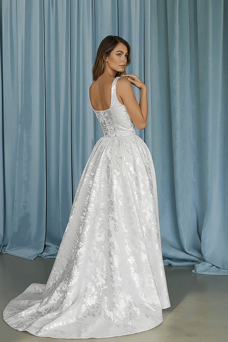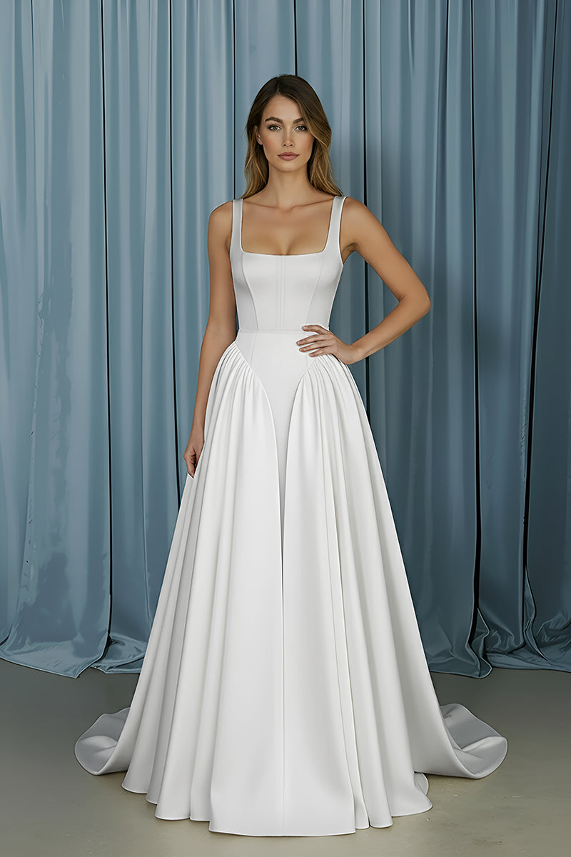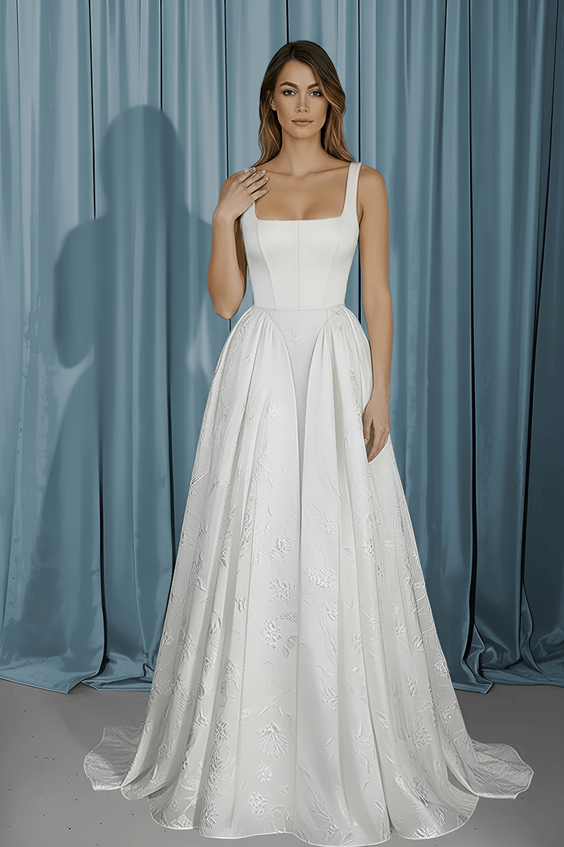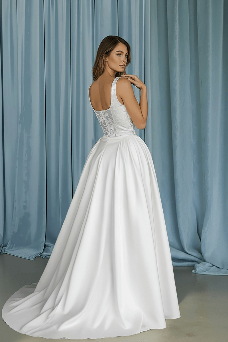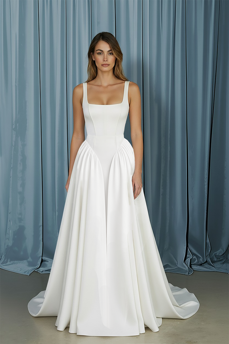 A structured square neckline with boning paired with a flowing A-line drop-waist skirt. The shirred sides provide a flattering fit for all body types, making this a simple and timeless choice.
