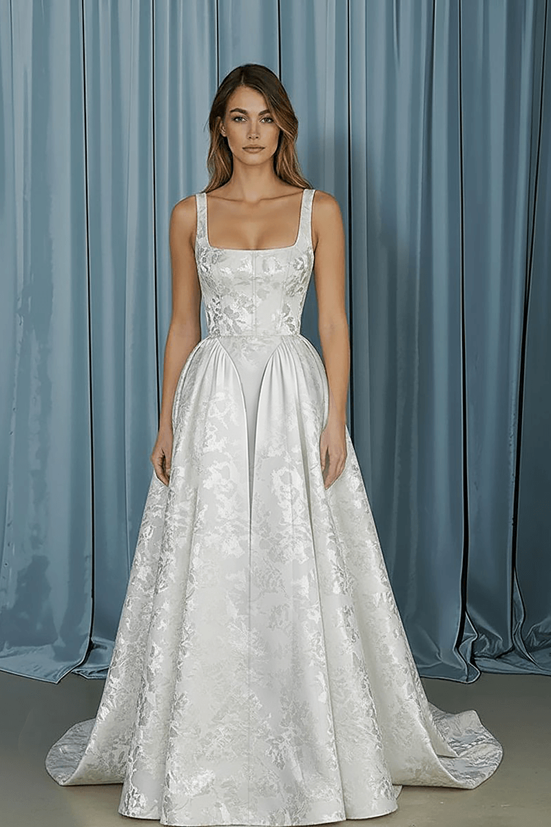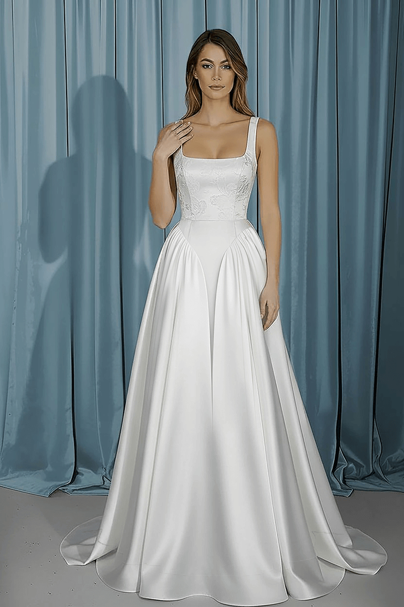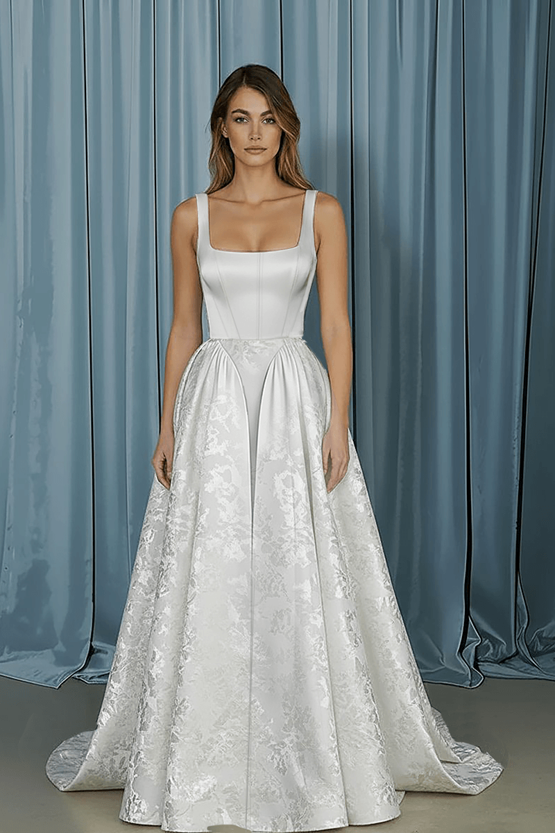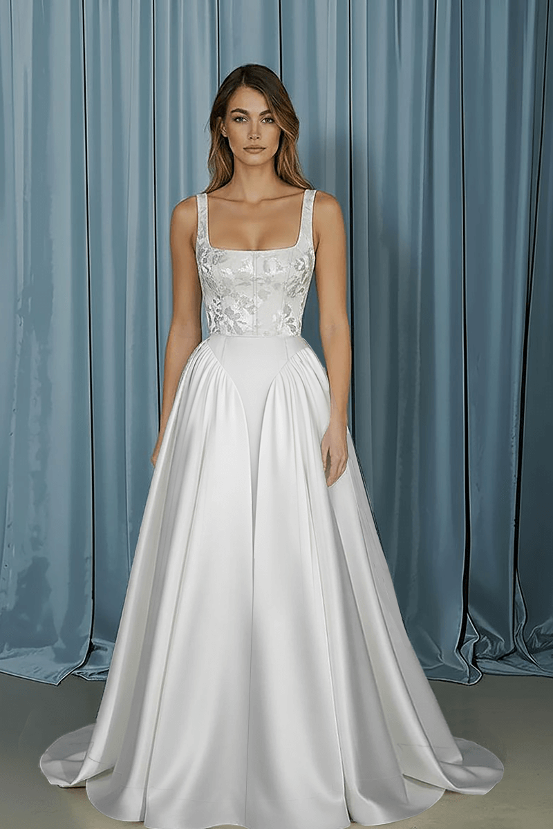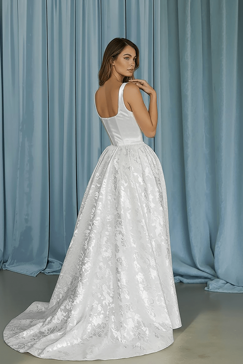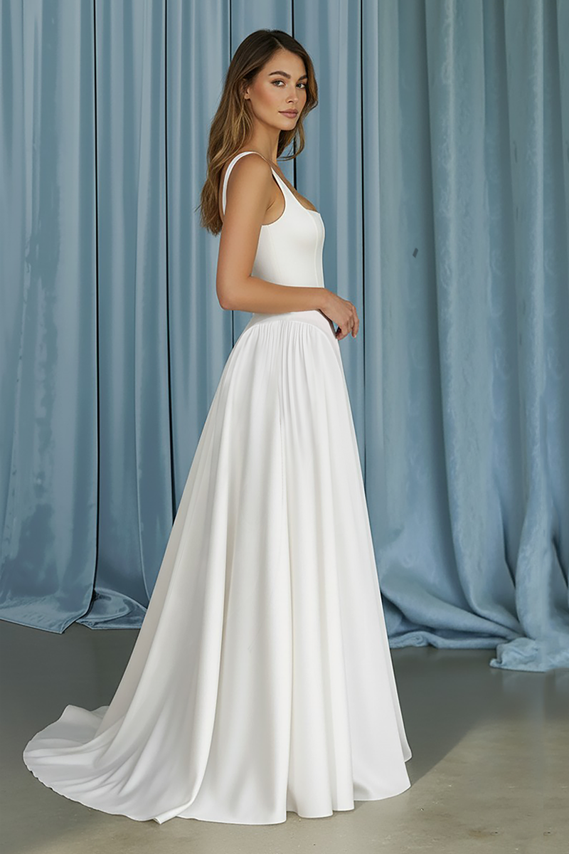 A structured square neckline with boning paired with a flowing A-line drop-waist skirt. The shirred sides provide a flattering fit for all body types, making this a simple and timeless choice.
