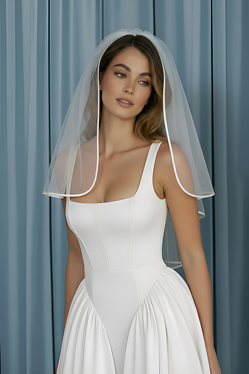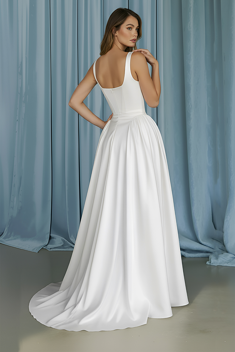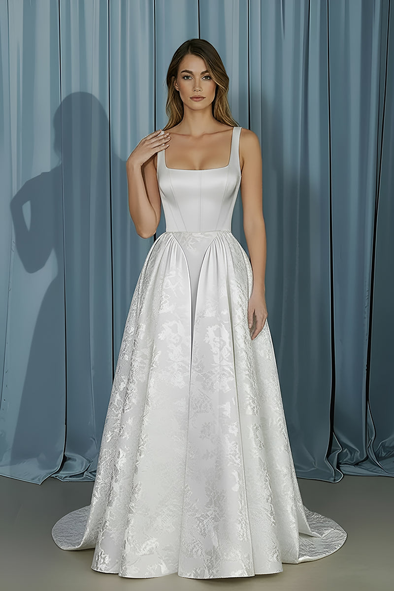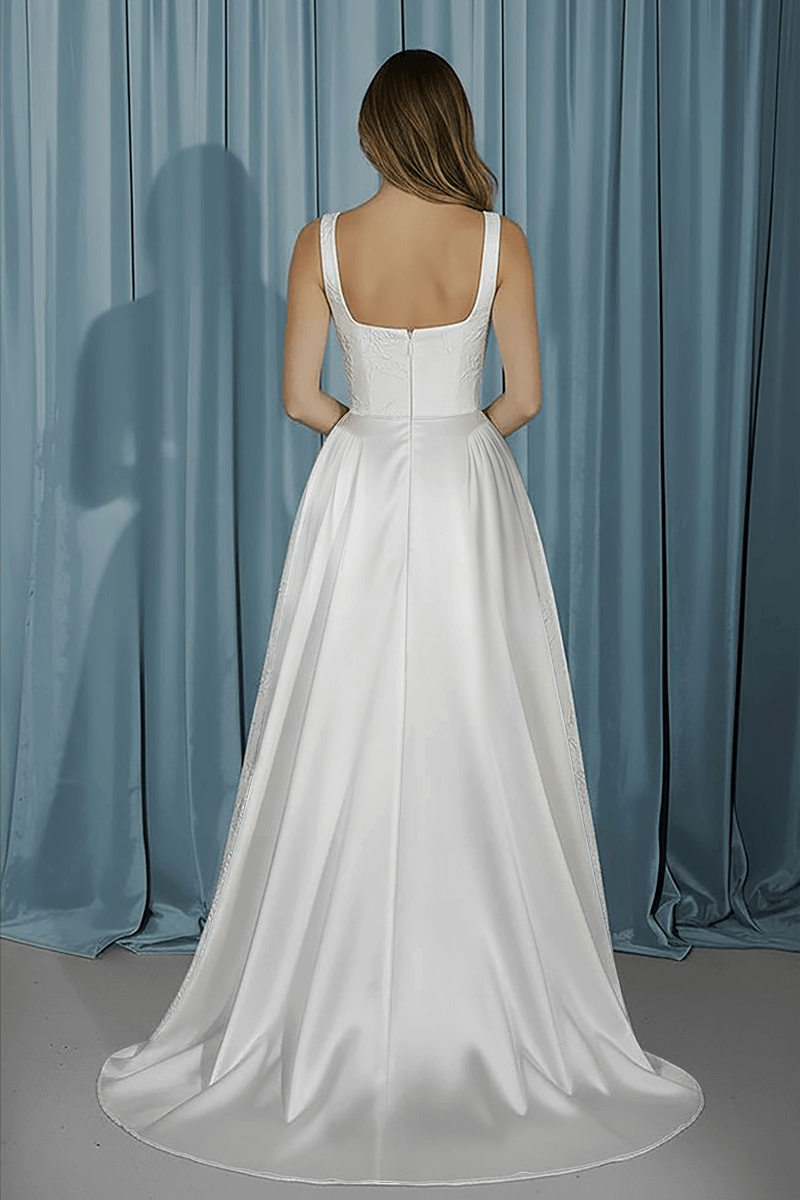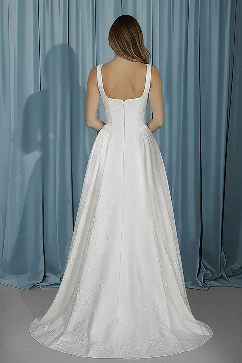 A structured square neckline with boning paired with a flowing A-line drop-waist skirt. The shirred sides provide a flattering fit for all body types, making this a simple and timeless choice.