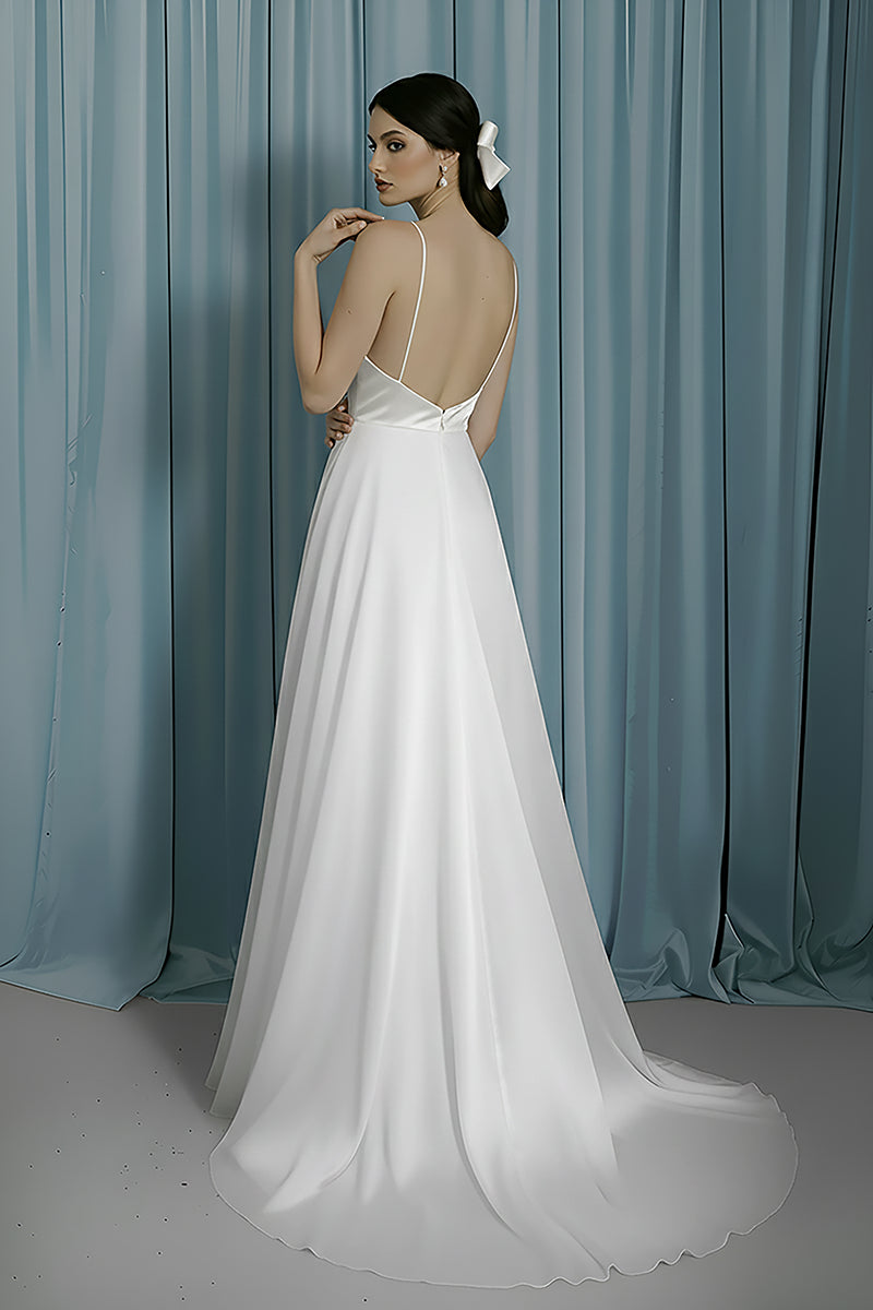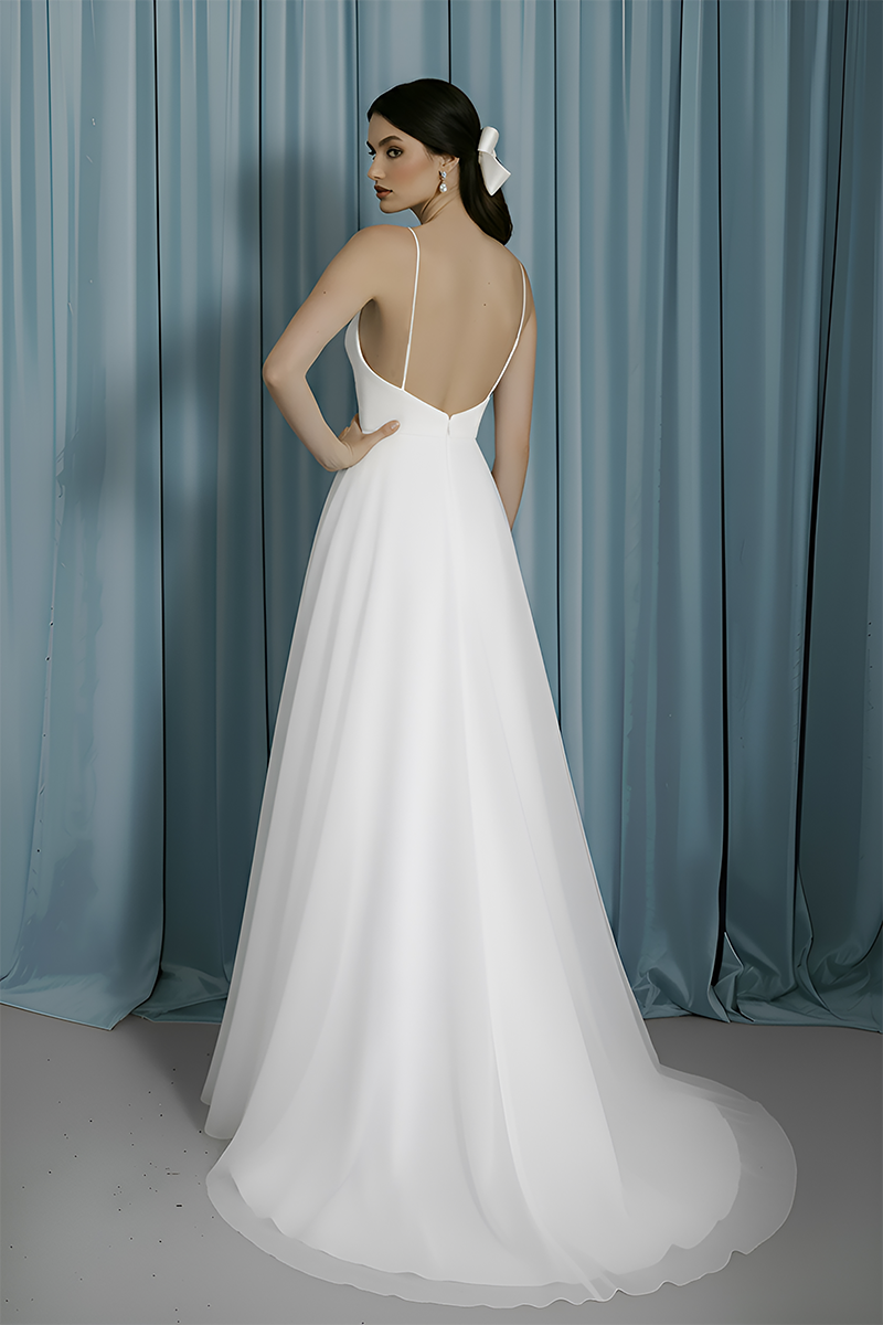 Step into the avant-garde world of modern bridal chic with this wedding dress featuring a deep neck and open back, adorned with delicate spaghetti straps. The A-line wrapped skirt adds a touch of whimsy, perfect for the fun-loving and bold bride who loves to party