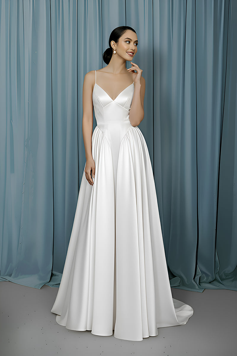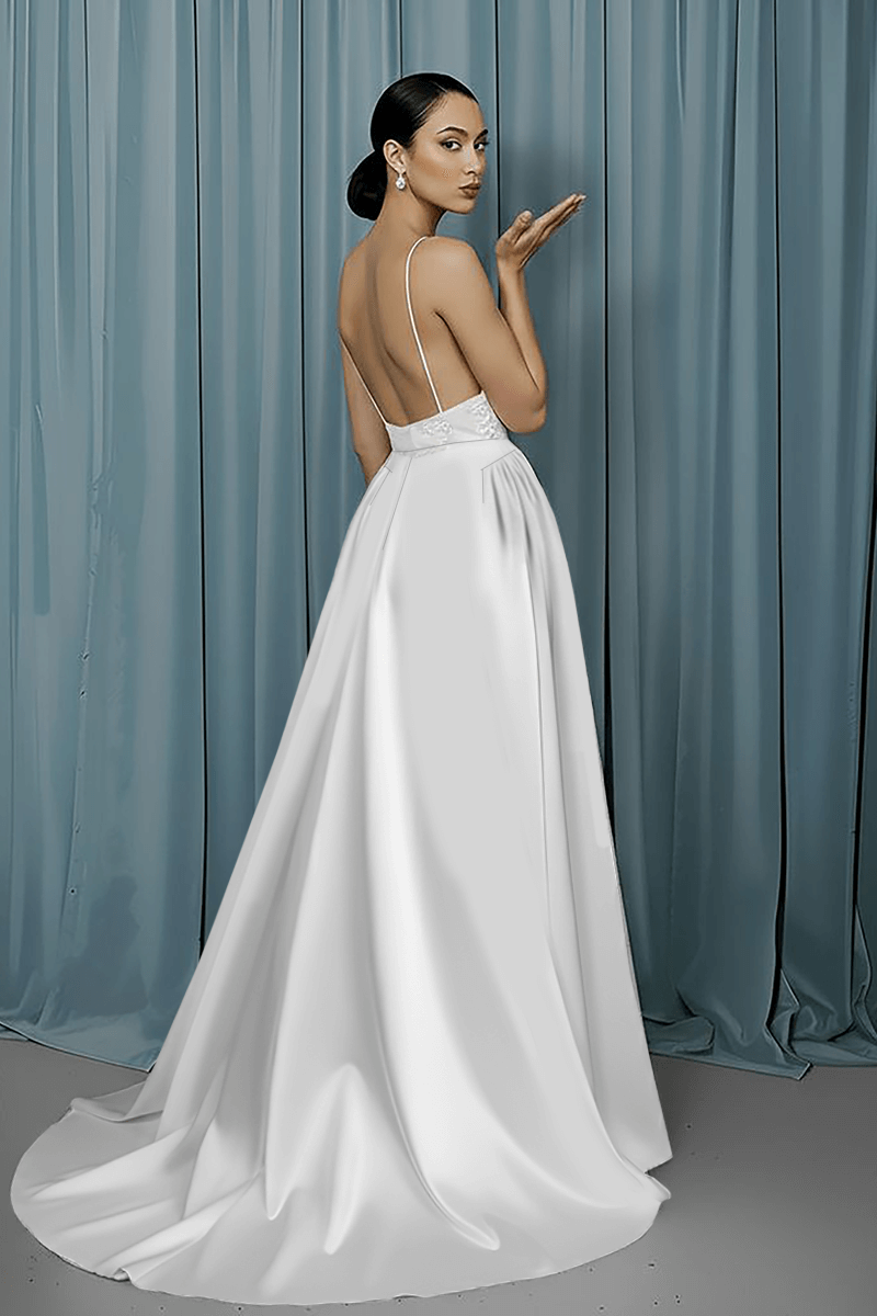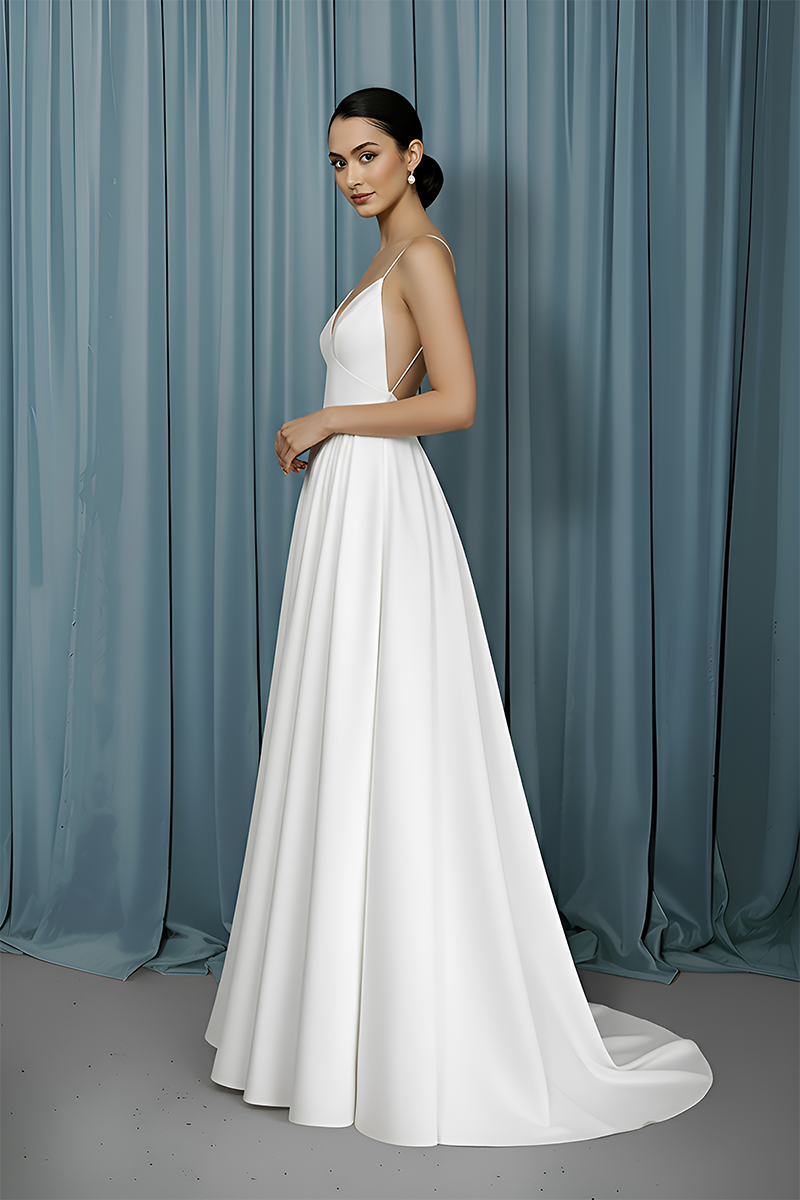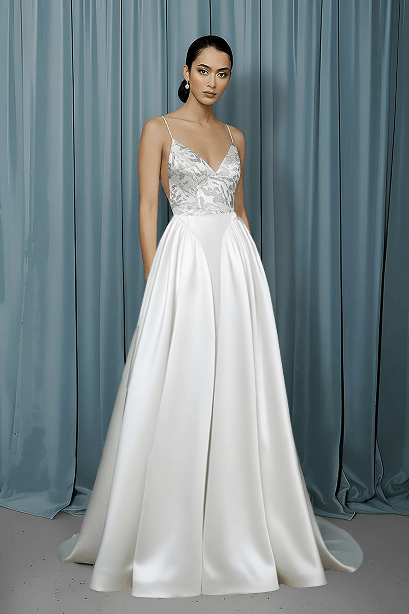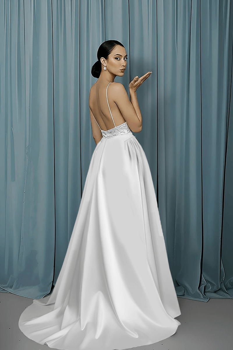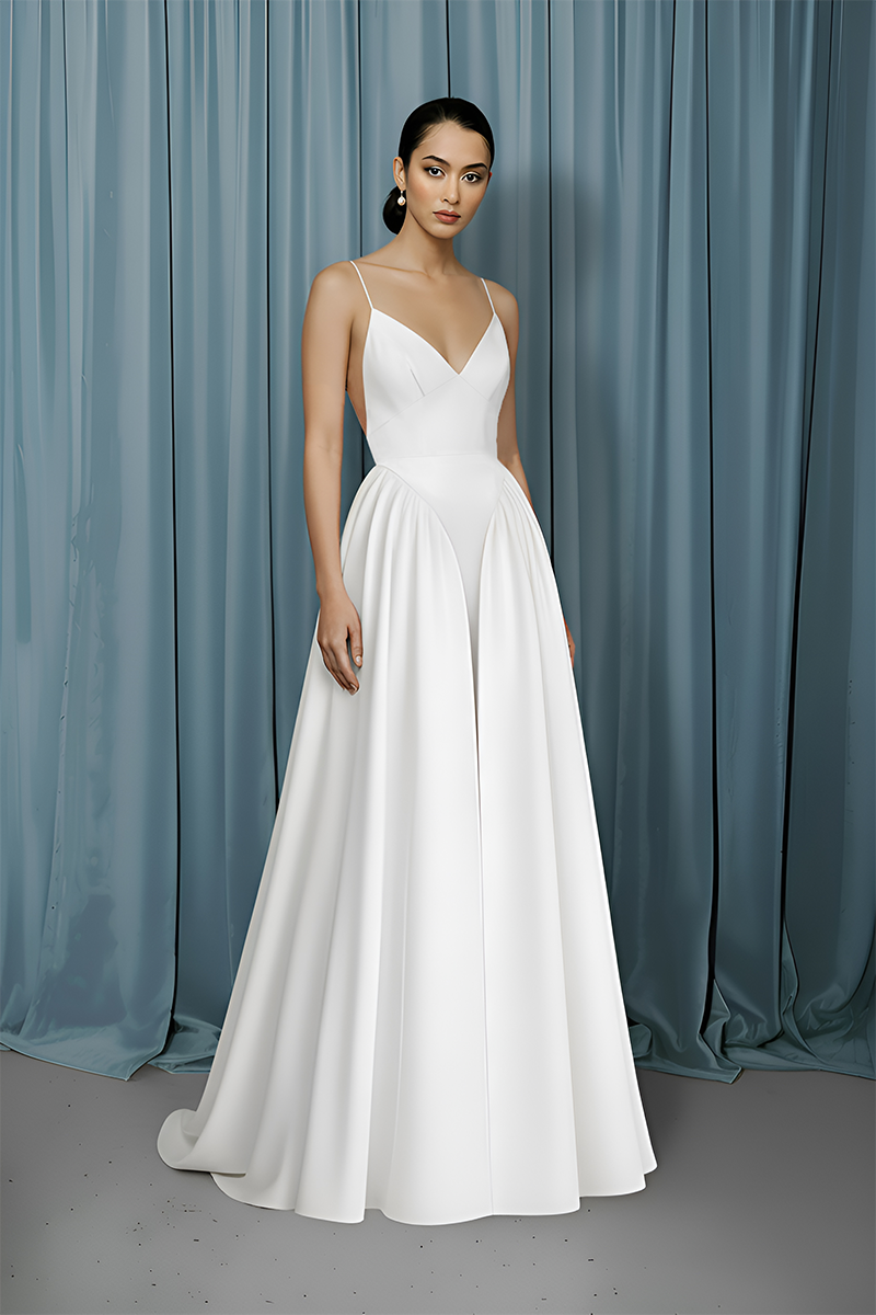 Exude classic charm with a twist of modern flair in this A-lined heavy satin skirt, paired with a deep neck and open back adorned with spaghetti straps. The timeless A-line silhouette, combined with the contemporary back design,