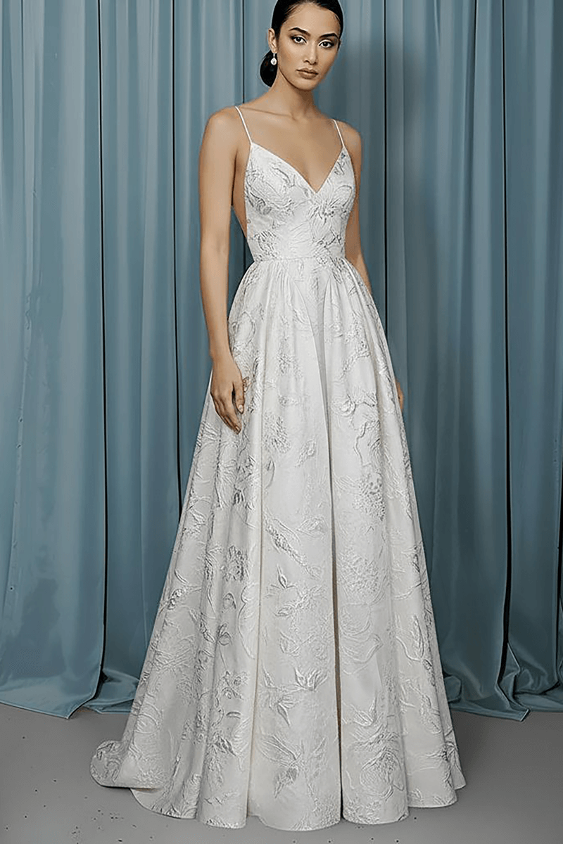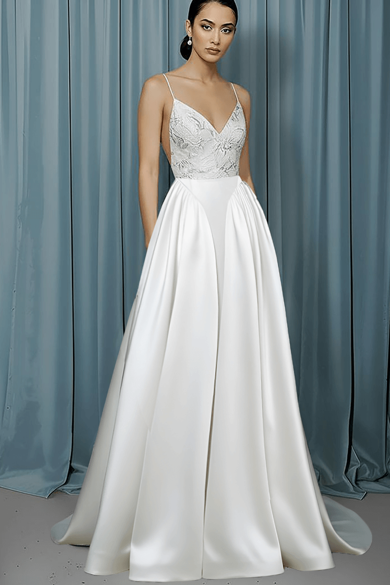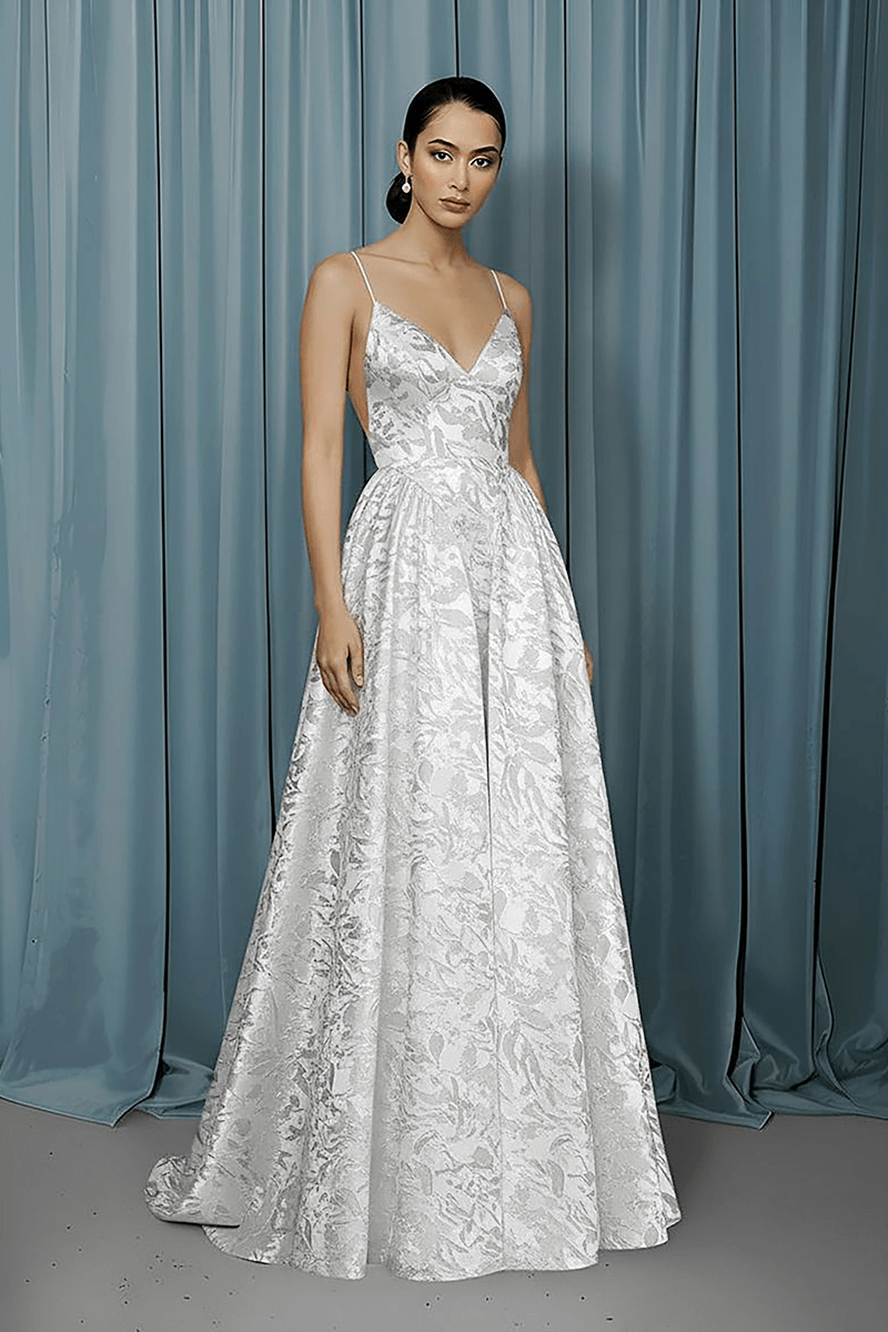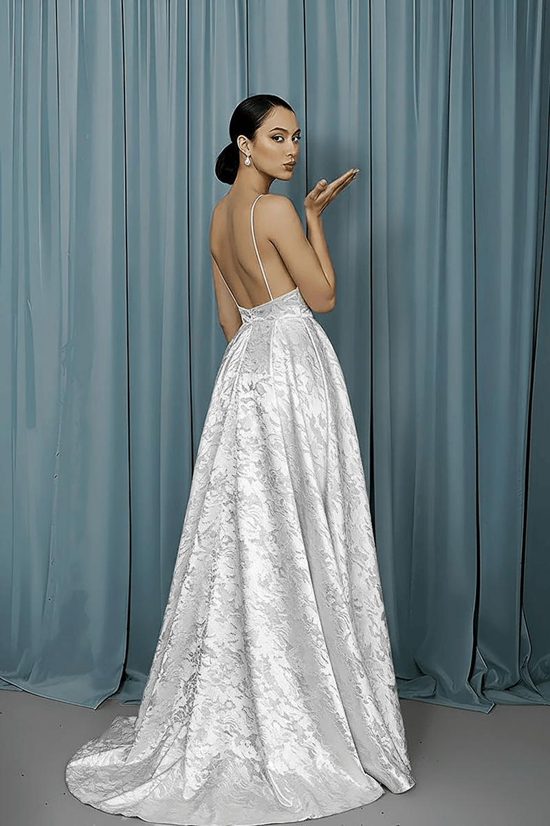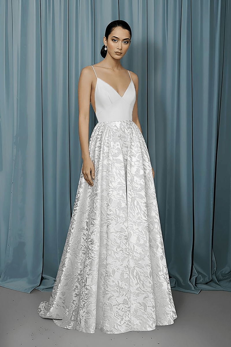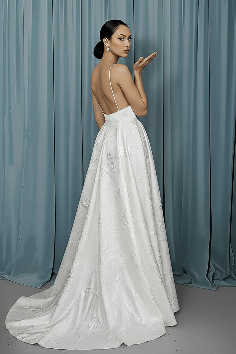 Exude classic charm with a twist of modern flair in this A-lined heavy satin skirt, paired with a deep neck and open back adorned with spaghetti straps. The timeless A-line silhouette, combined with the contemporary back design,