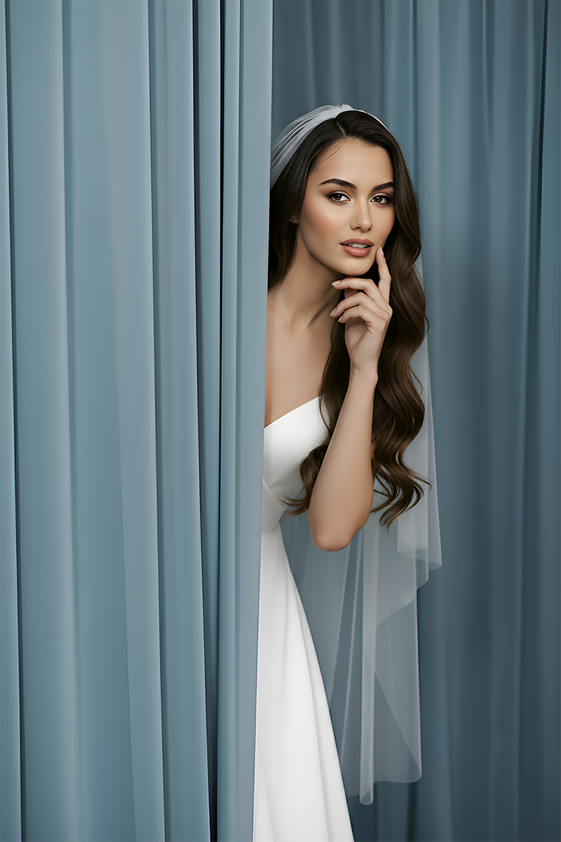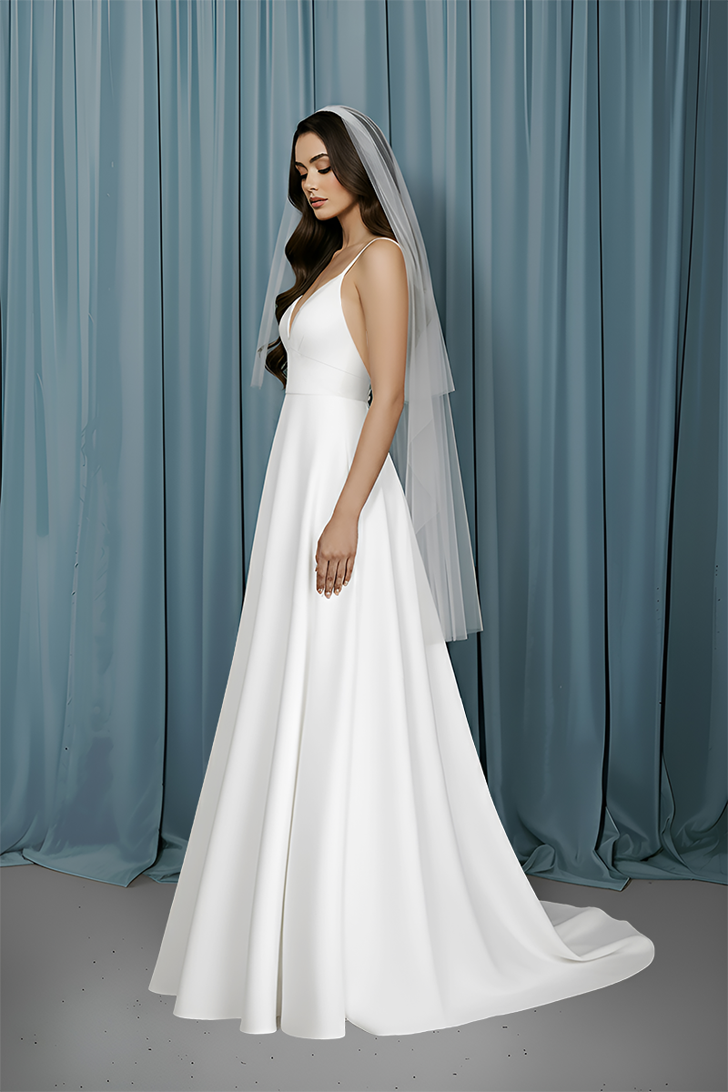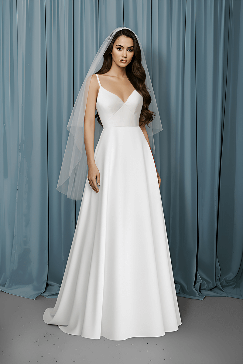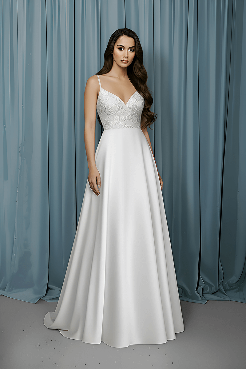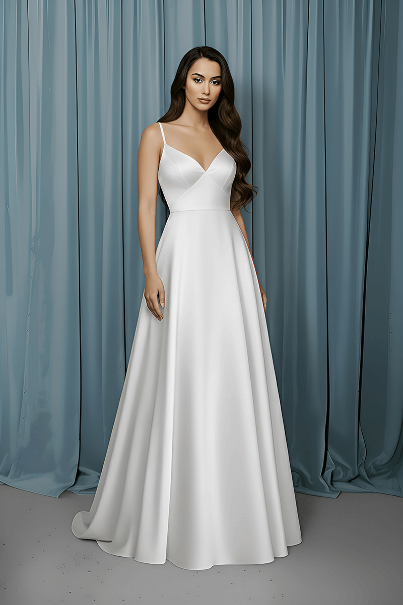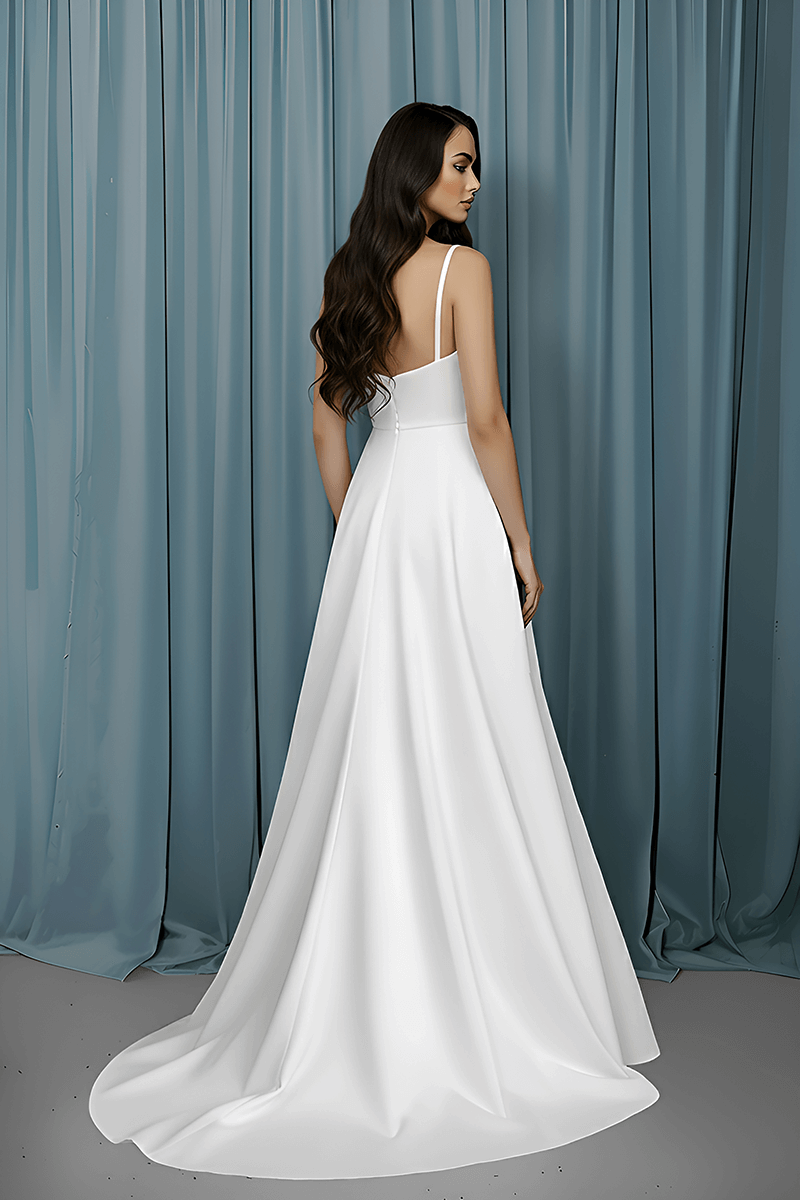 Exude classic charm with a twist of modern flair in this A-lined heavy satin skirt, paired with a deep neck and open back adorned with spaghetti straps. The timeless A-line silhouette, combined with the contemporary back design, creates an effortlessly romantic and bold bridal look.