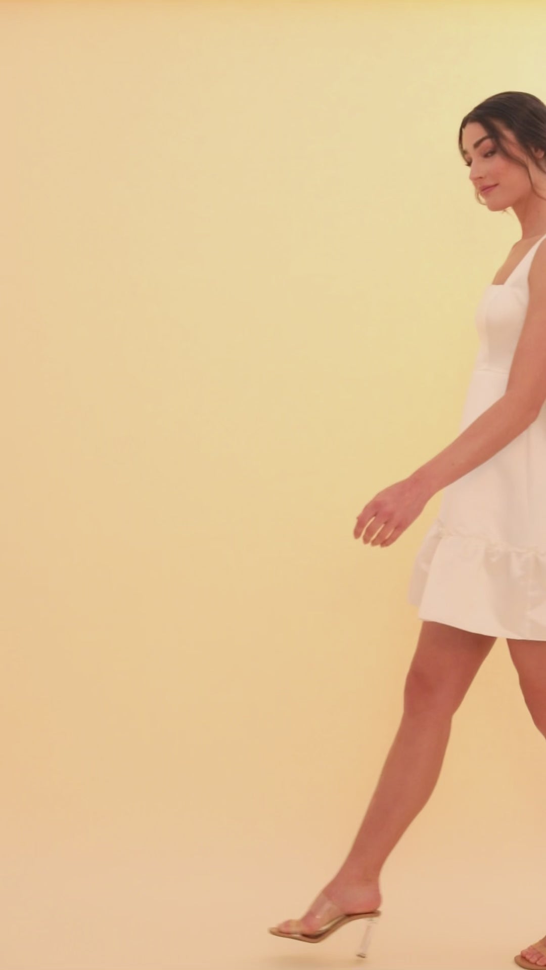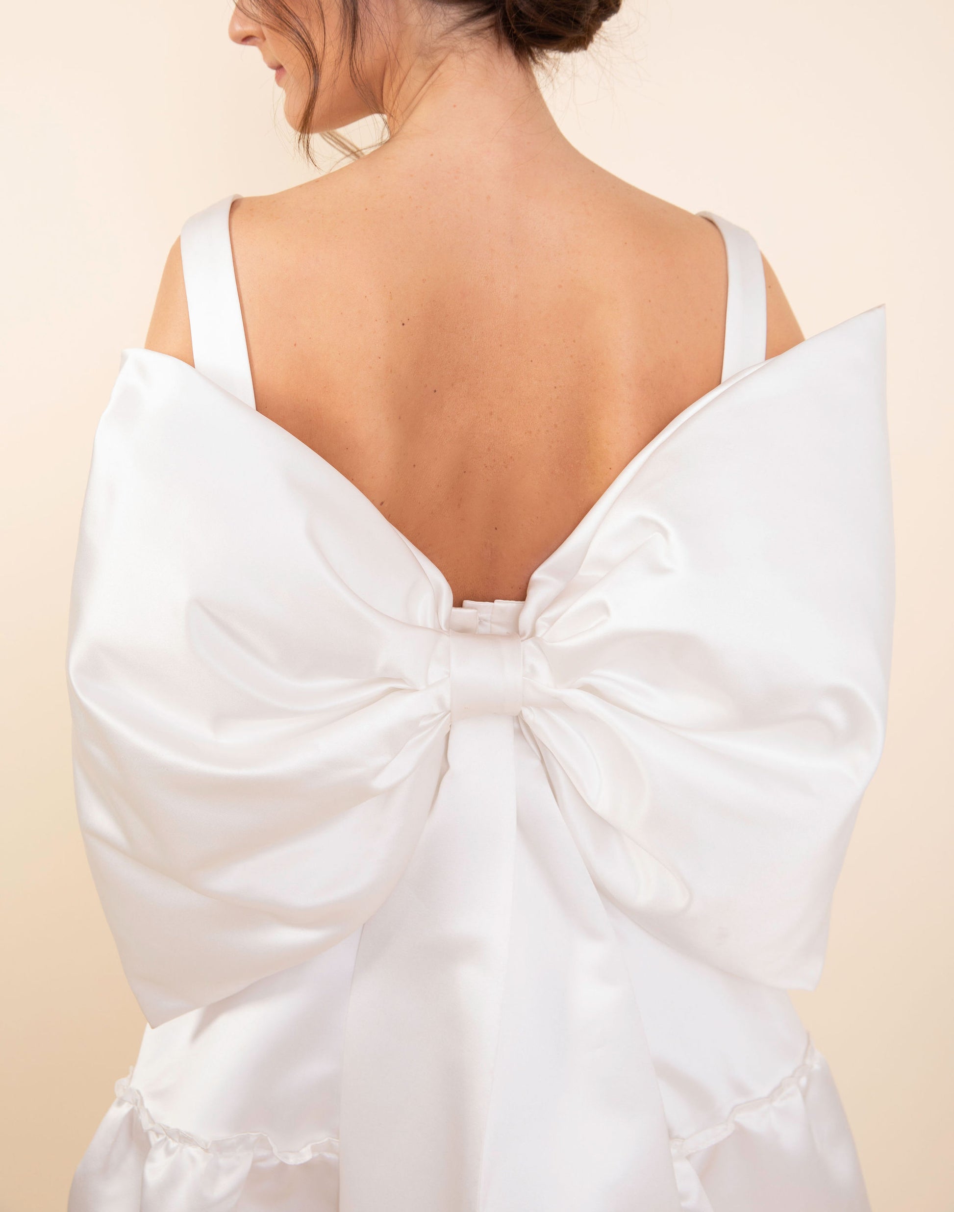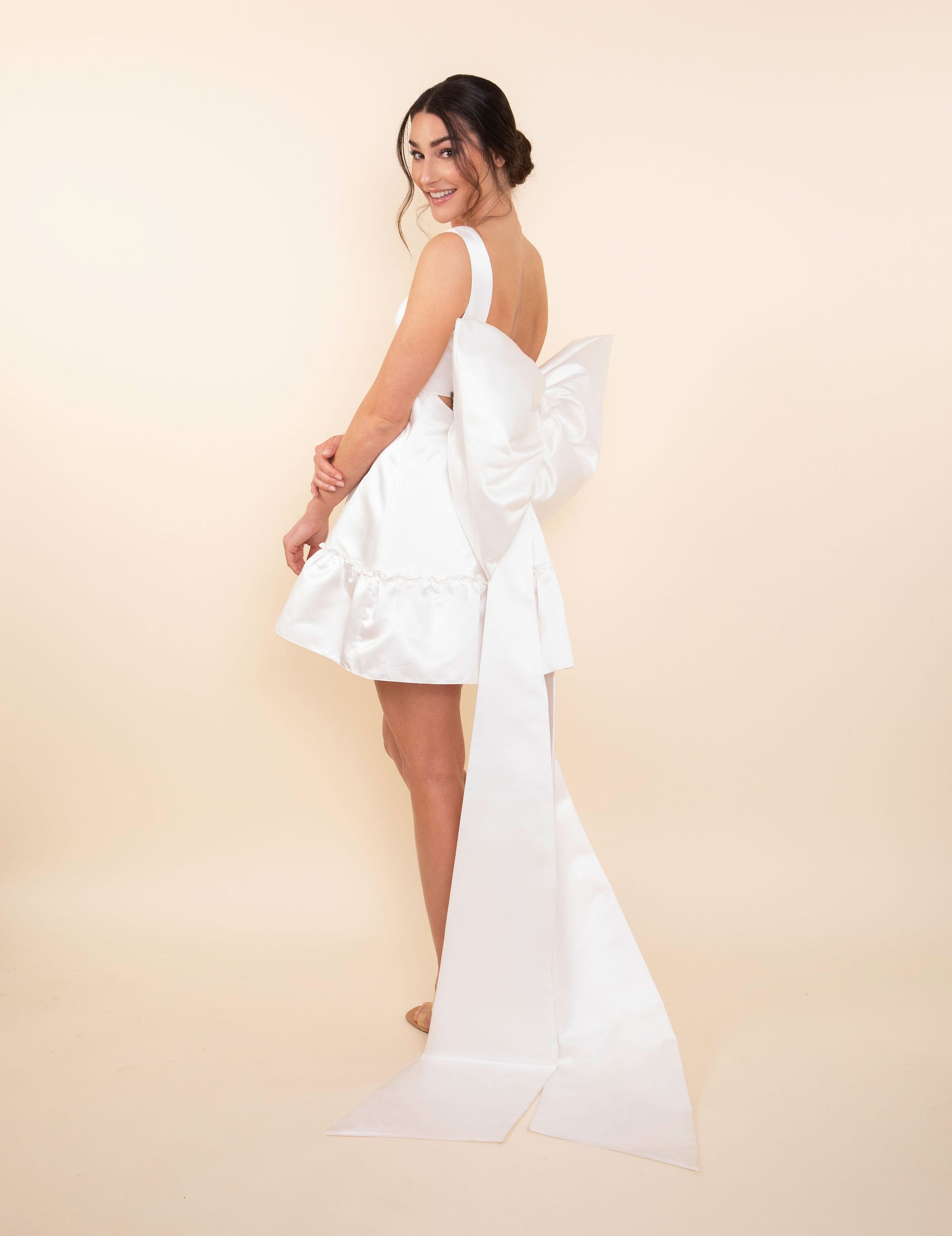 This sophisticated babydoll dress is perfect for the modern bride. With a structured silhouette that accentuates the bust, the dress is embellished with a large bow for added drama and flair. The bow is detachable with two snaps from the back.